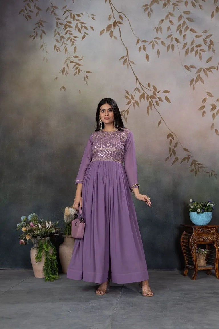 👉🏻 GOWN 👉🏻 FABRIC & WORK:- Faux Georgette with Embroidery Zari Sequins-work👉🏻SIZE:-M(38''),L(40''),XL(42''),XXL(44'')👉🏻LENGTH:-56 INCH👉🏻FLAIR:-3.5 MTR👉🏻LINING:-Cotton (Full...