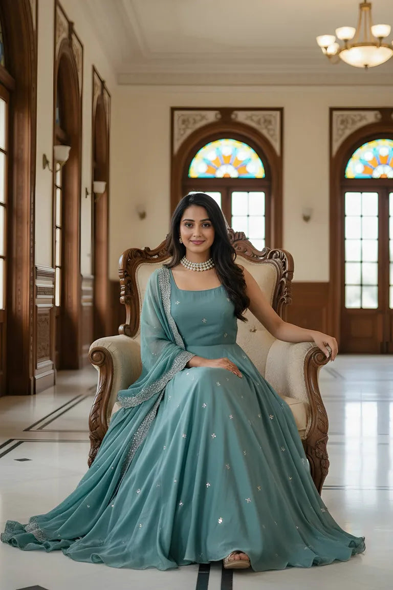 Elegance in simplicityThis pastel teal Anarkali with delicate embroidery is the perfect blend of grace...
