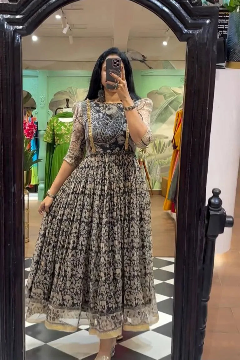 Launching our stunning flared gown featuring elegant pen kalamkari panel designs adorned with animal motifs....