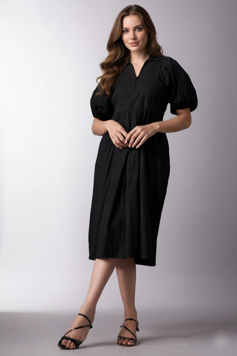 Description: Introducing our Black Short Elbow-Sleeve Button-Down Dress, a chic and stylish addition to your...