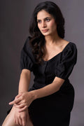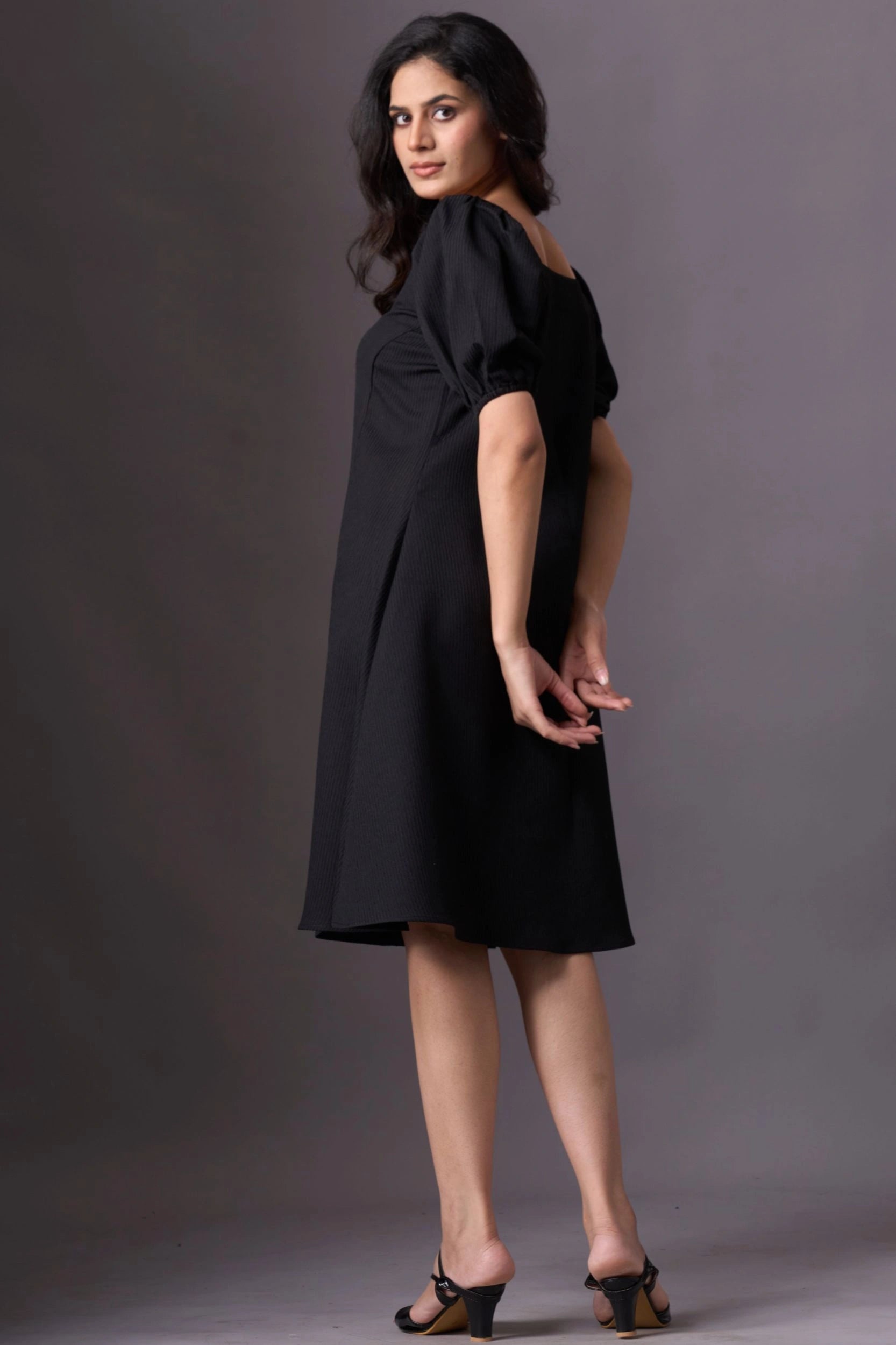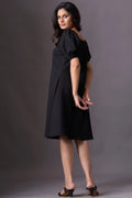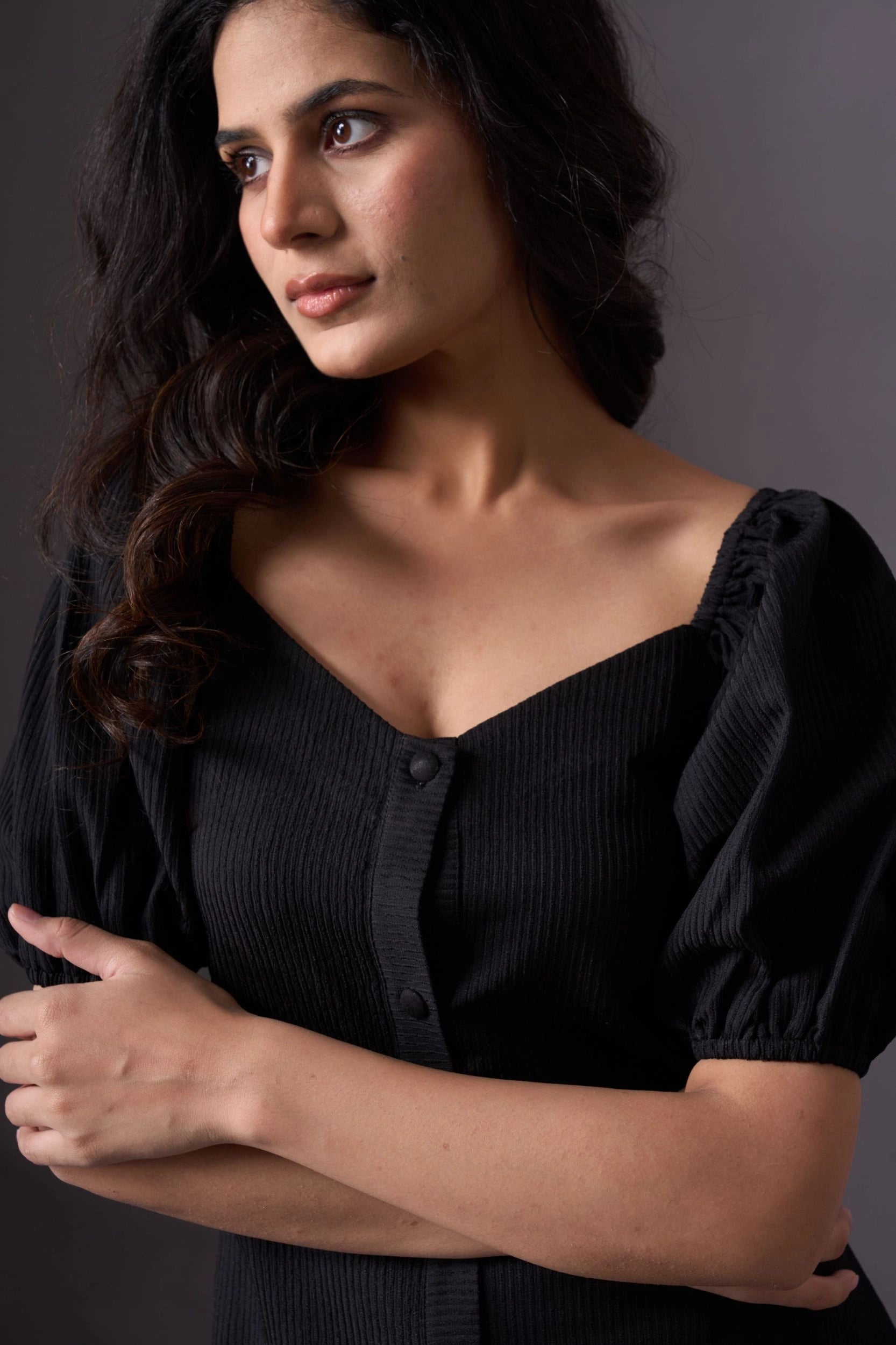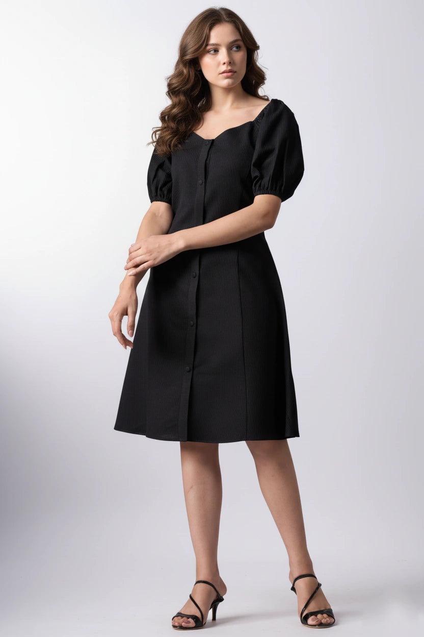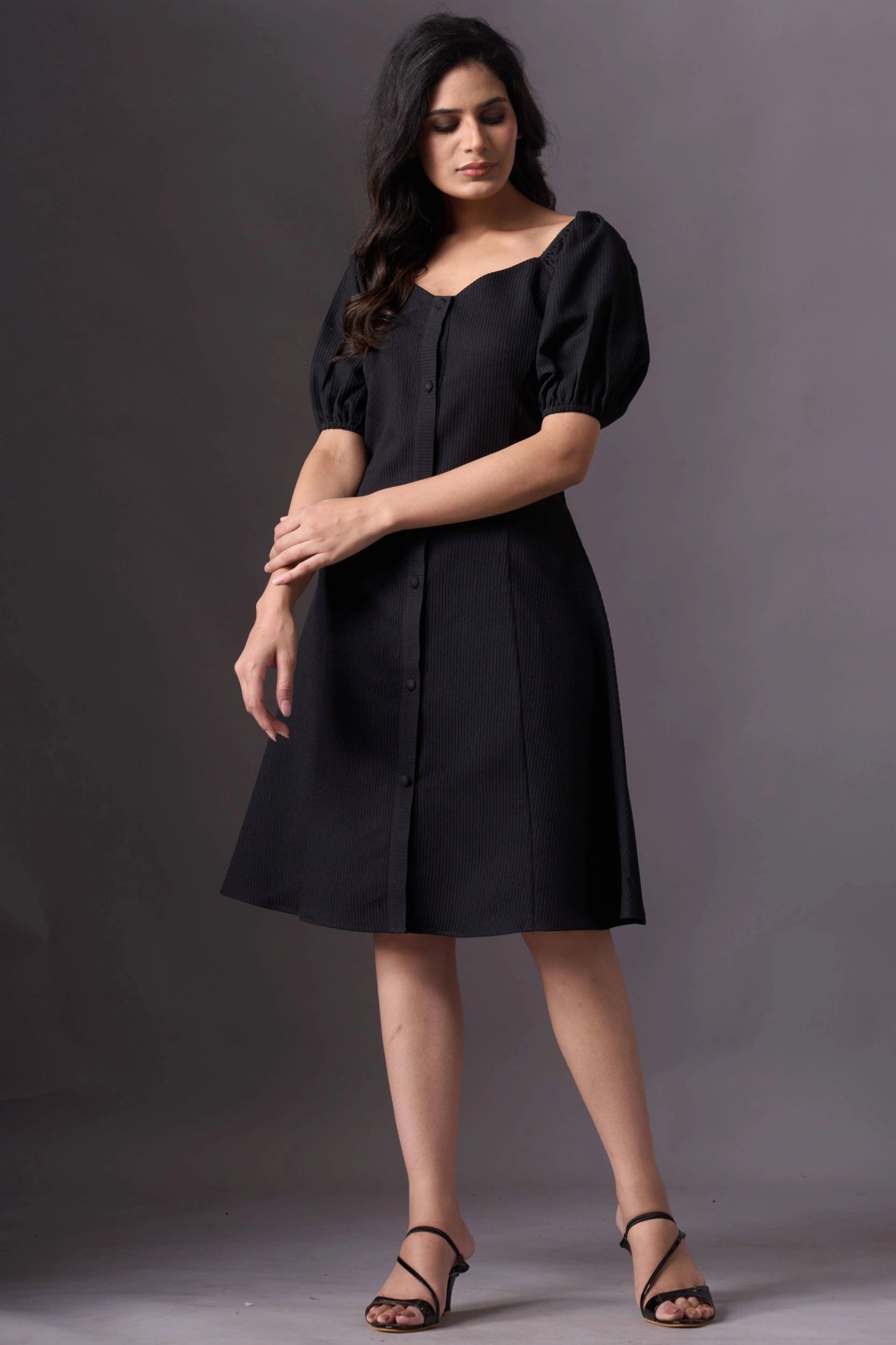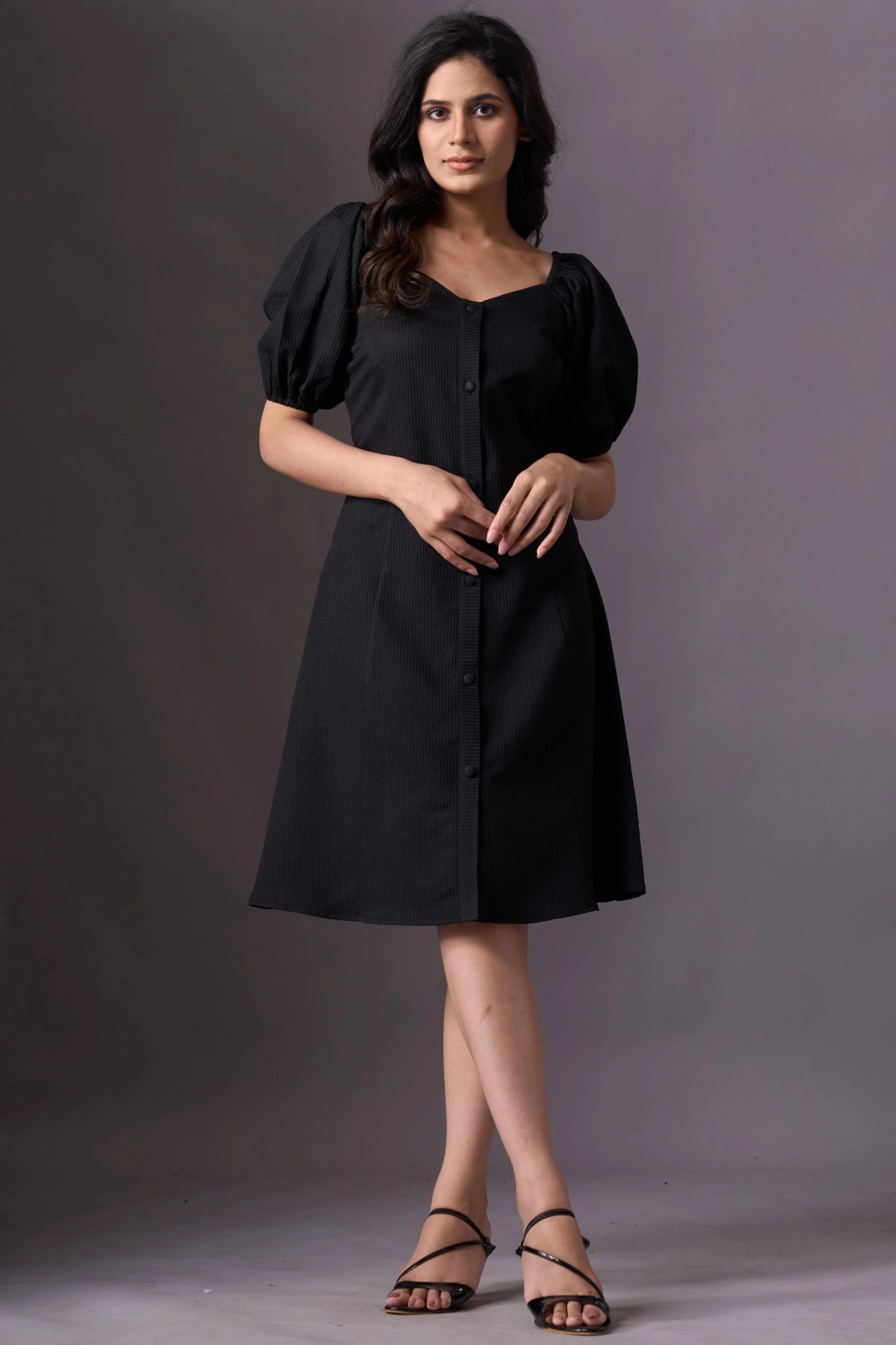 Introducing our Black Short Elbow-Sleeve Button-Down Dress, a chic and stylish addition to your wardrobe. This dress features short puffed sleeves and a button-down front. The slightly flared skirt falls above the knees, creating a playful and elegant silhouette. Perfect for both casual and semi-formal occasions, this dress effortlessly combines comfort and style."