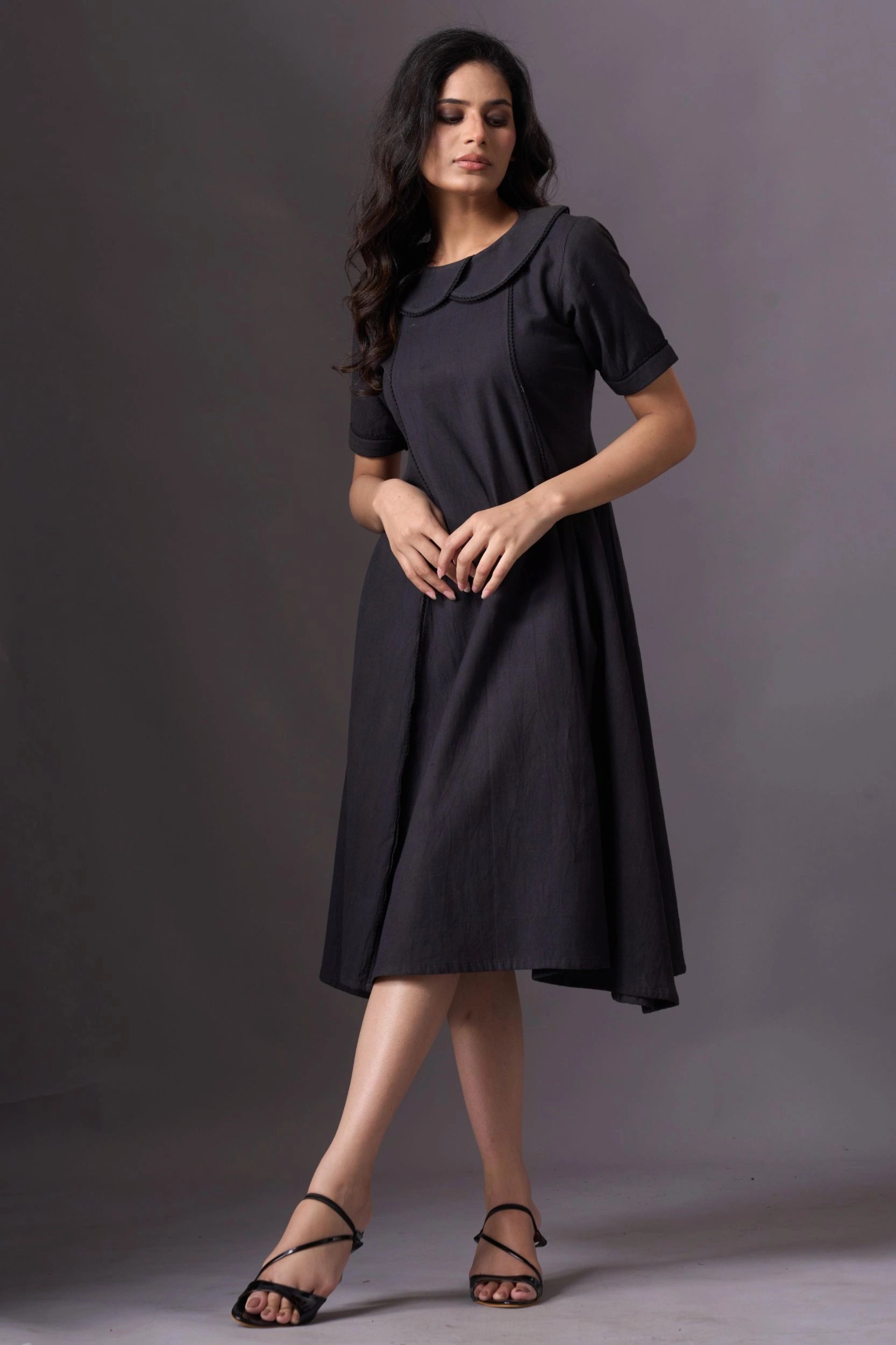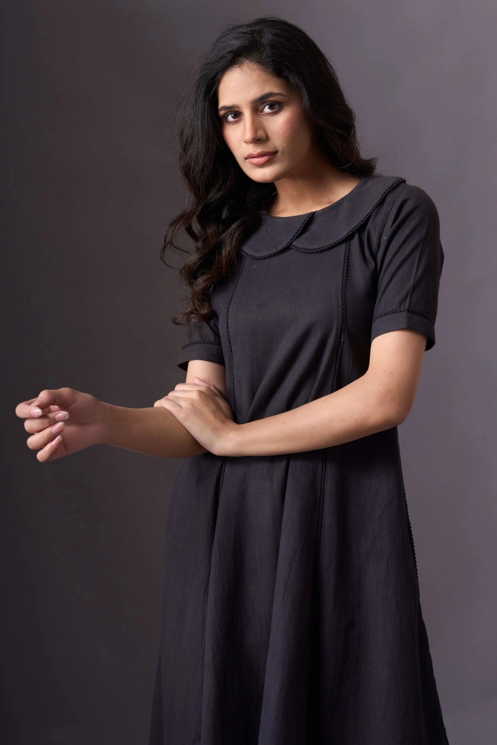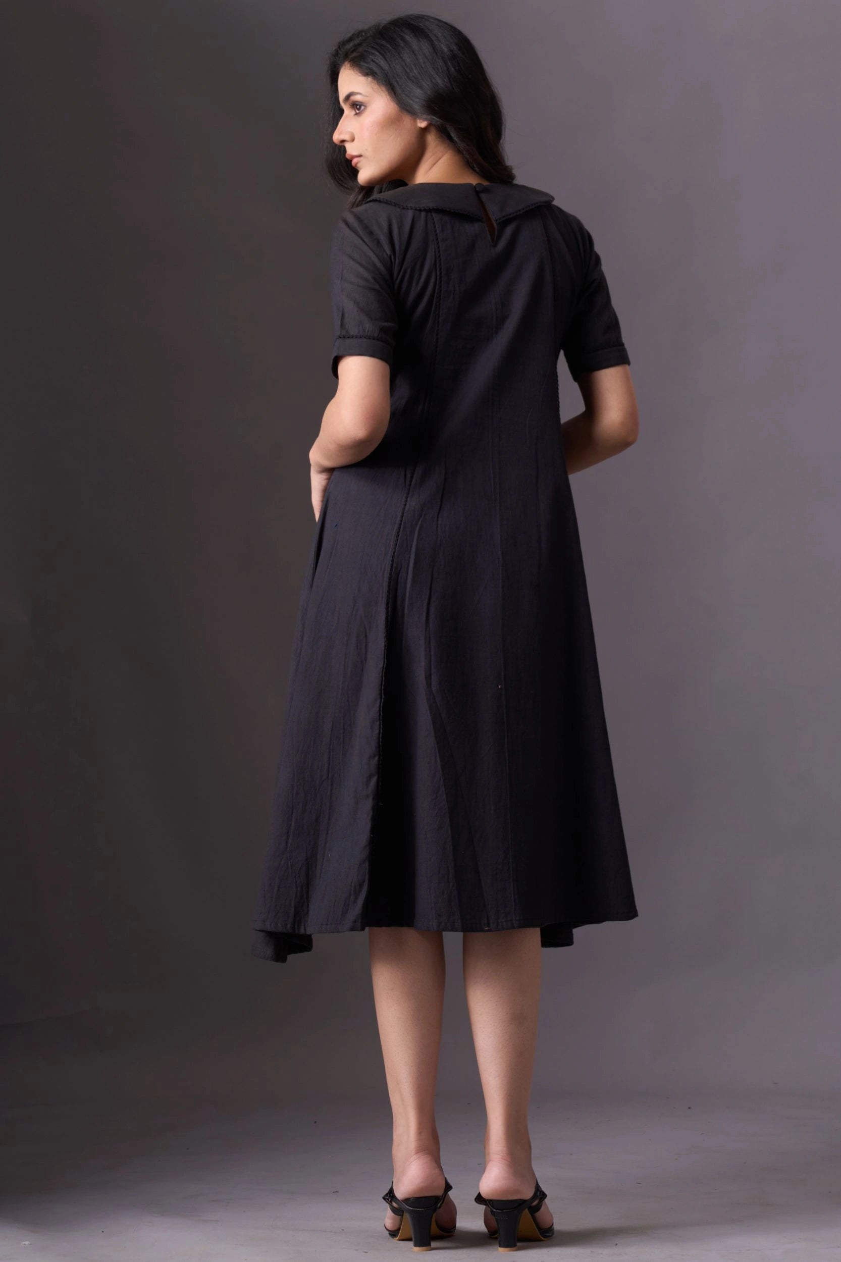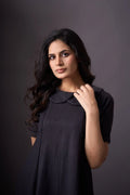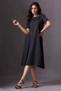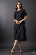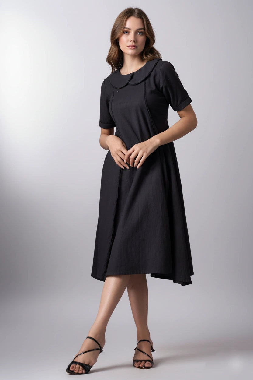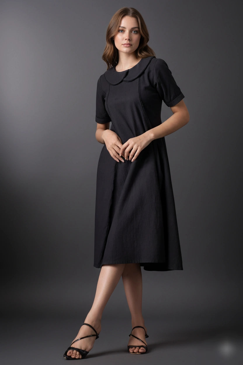 Introducing our Dark Knee-Length Short-Sleeve Dress, a chic and versatile addition to your wardrobe. This dress features short sleeves and a rounded collar, offering a classic yet modern look. The knee-length design provides a flattering silhouette, while the dark color adds an elegant touch. Perfect for various occasions, this dress combines style and comfort effortlessly.