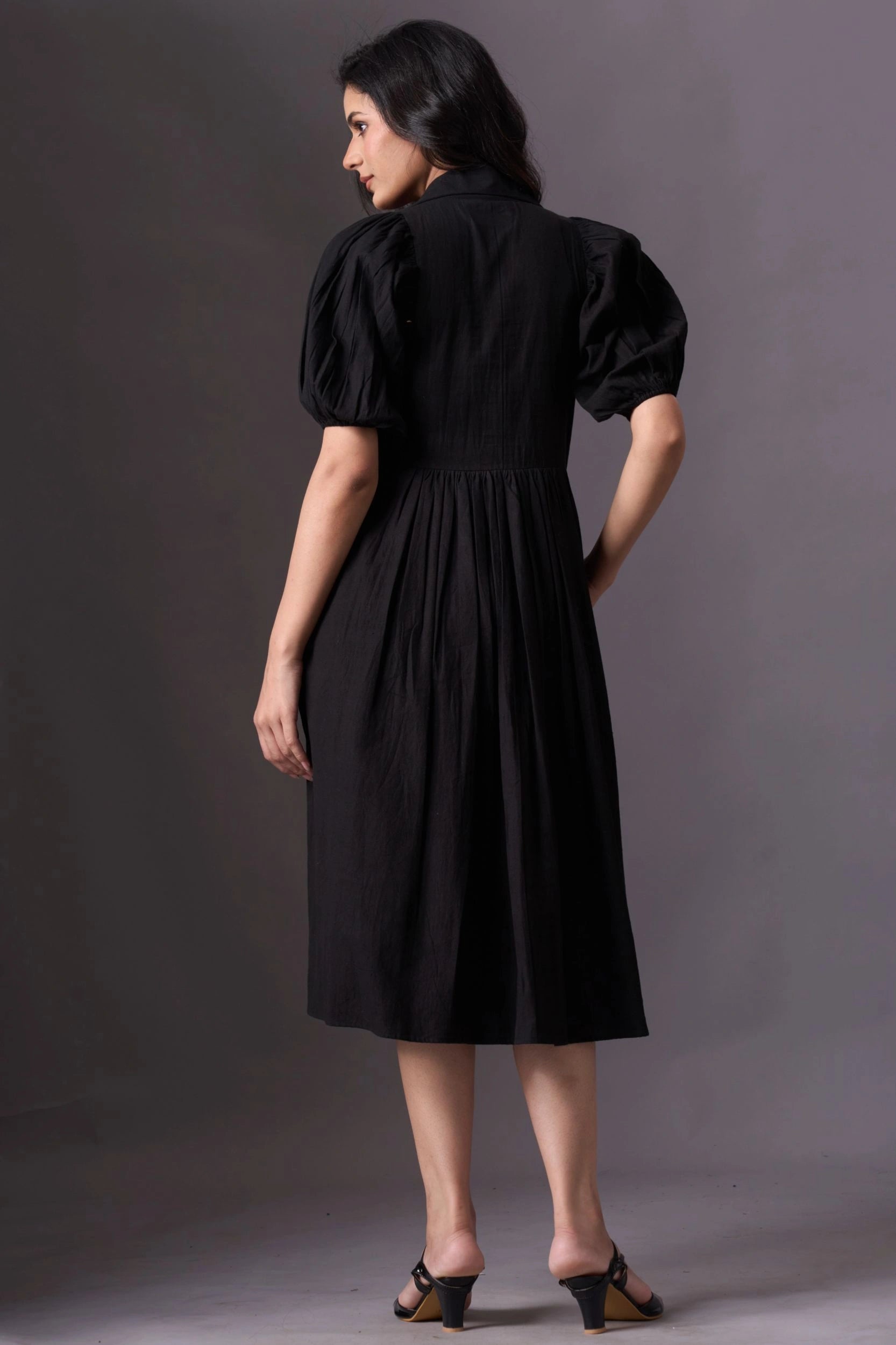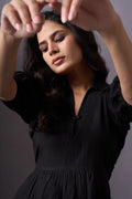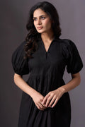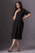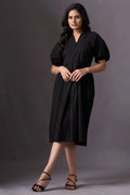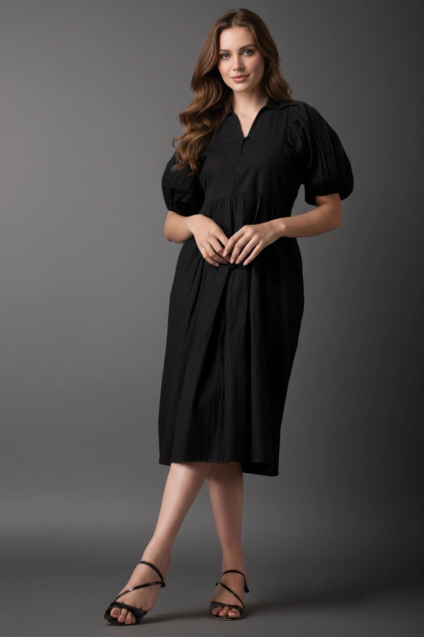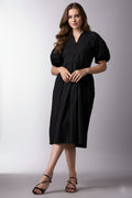 Introducing our Black Short-Sleeve V-Neck Dress, a chic and practical addition to your wardrobe. This knee-length dress features short puffed sleeves and a stylish V-neckline. The loose, flowing fit, making it perfect for various occasions.