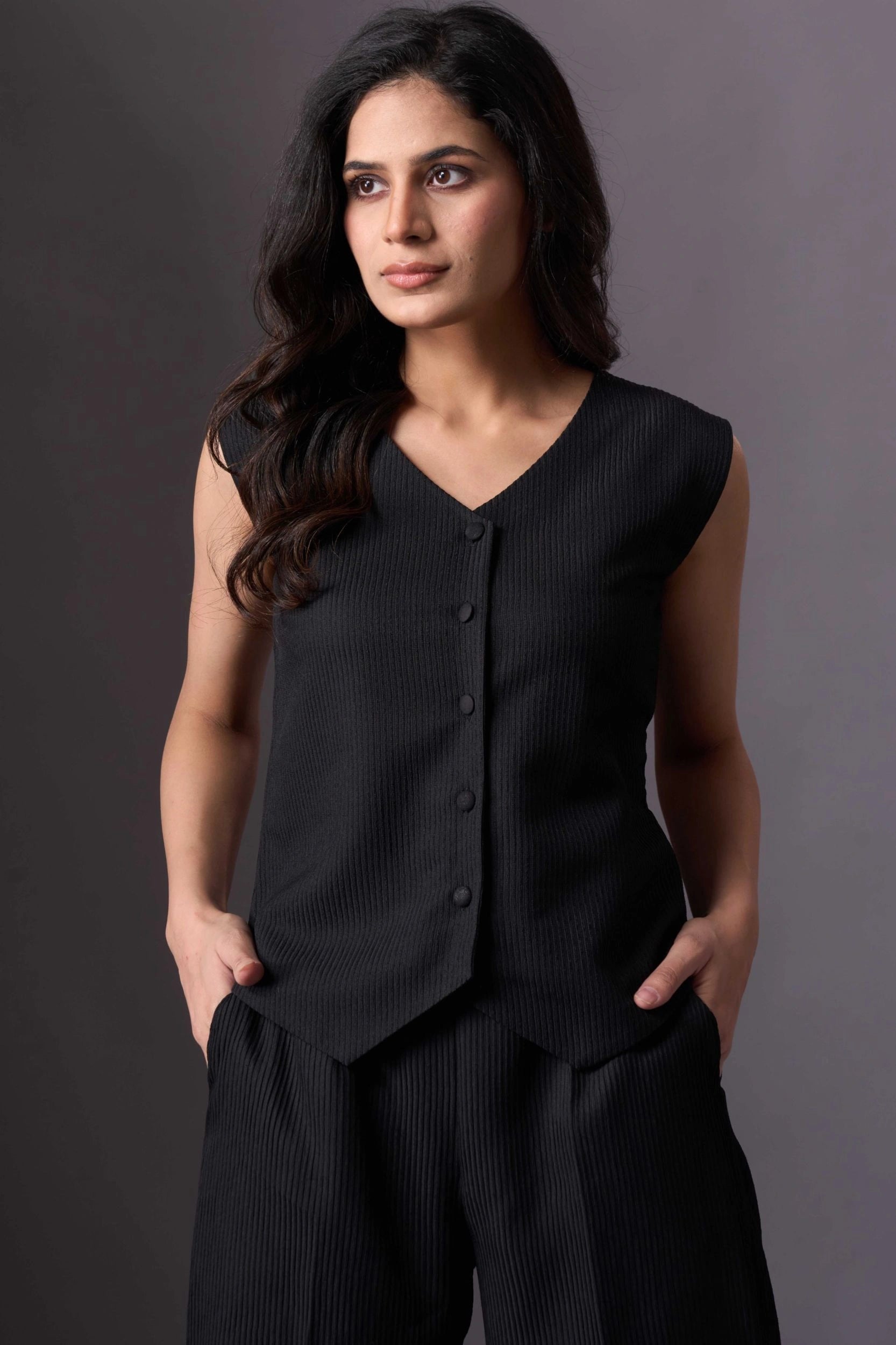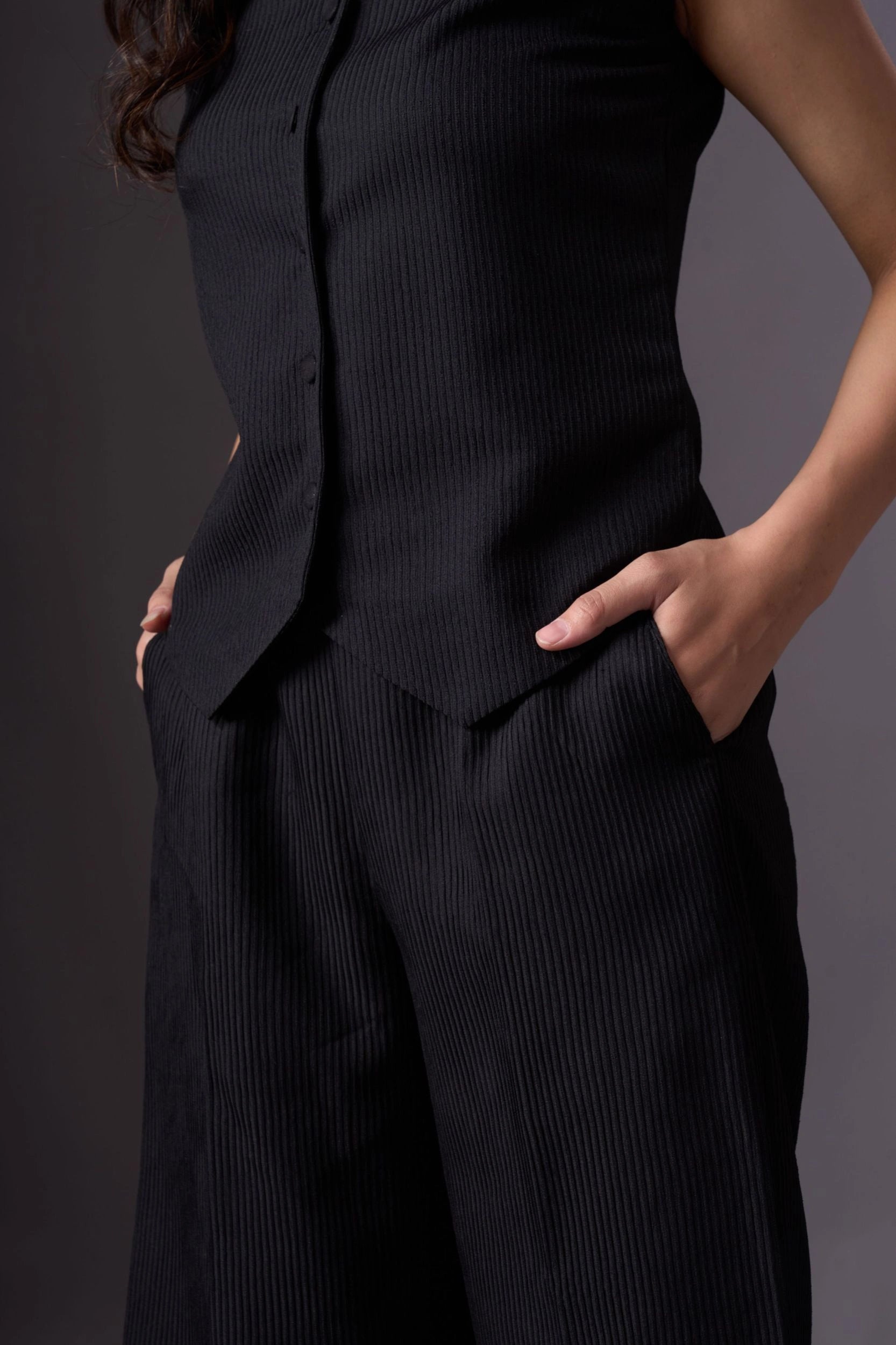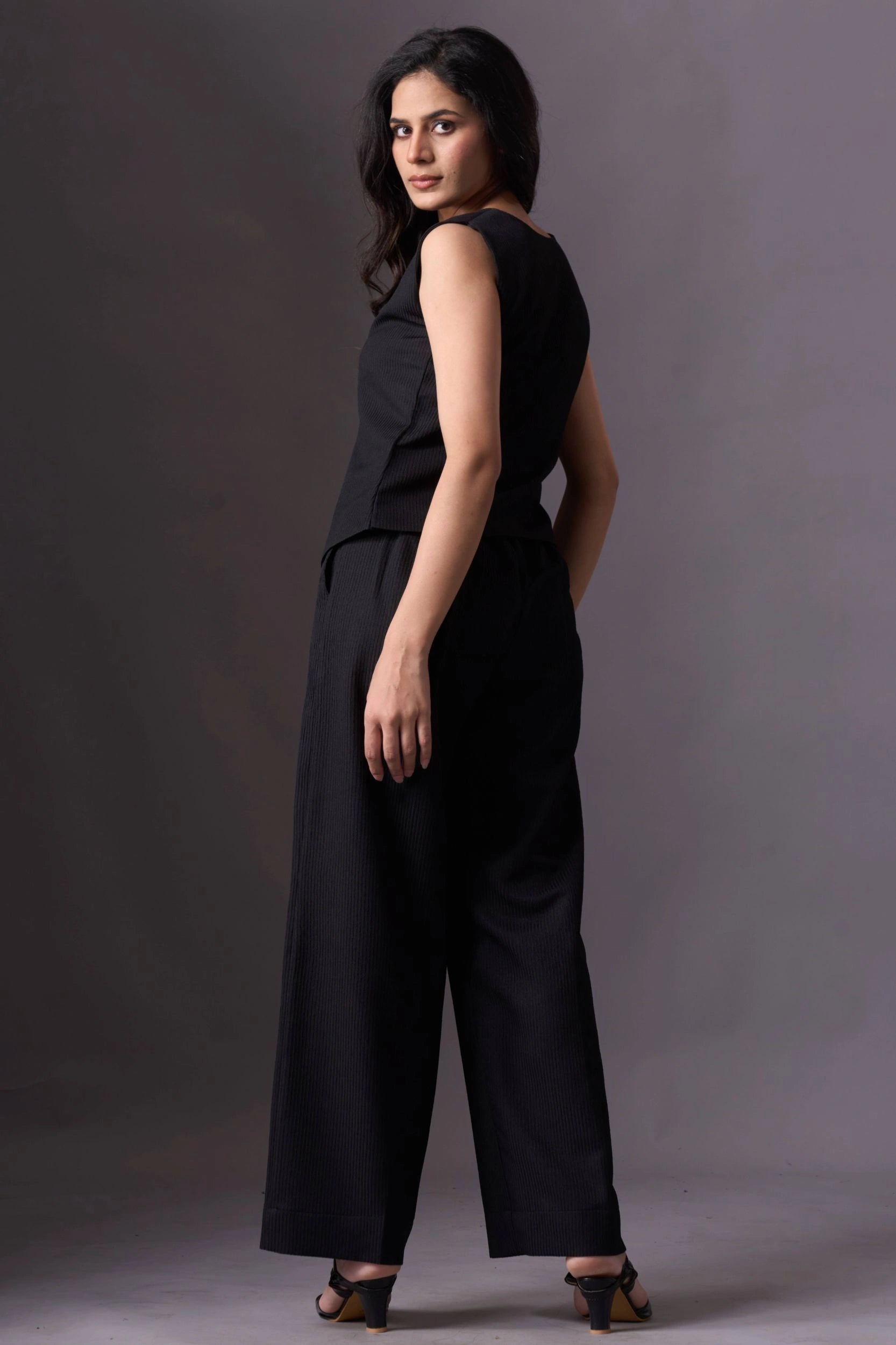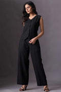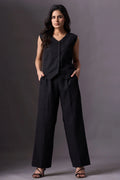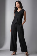 Introducing our Black Sleeveless Top and Wide-Legged Pants Set, a chic and comfortable addition to your wardrobe. This ensemble features a sleeveless top with buttons down the front, paired with matching wide-legged pants. The outfit is perfect for various occasions, offering both style and ease.