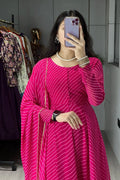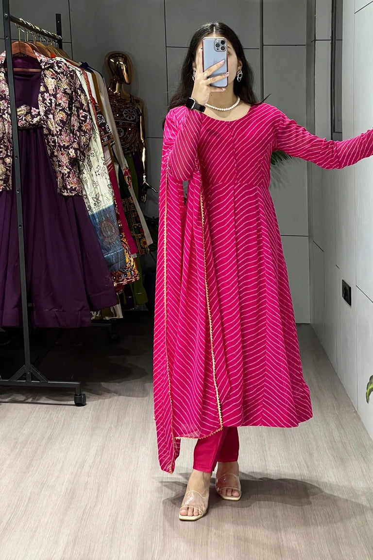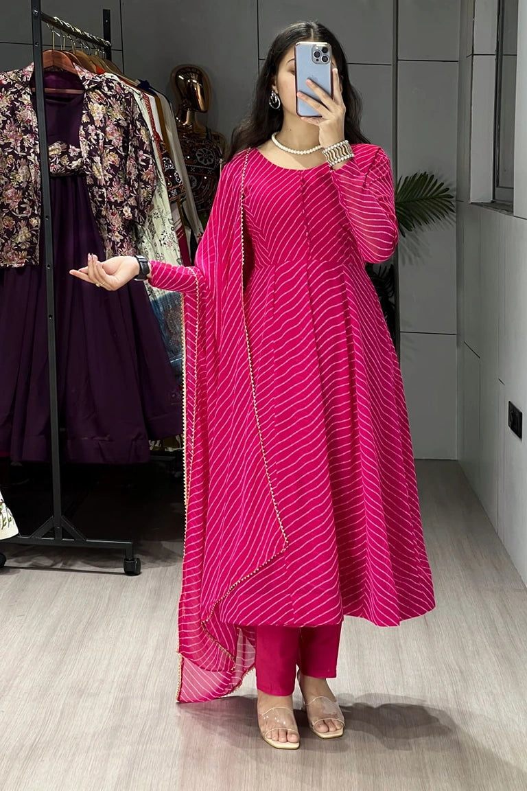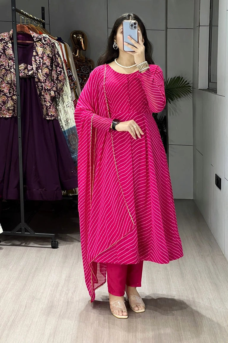 Crafted in bright rani hues, this leheriya print kurti set with dupatta reflects cultural elegance, perfect for weddings, pujas, and festive flowy silhouette and dupatta that add grace and sophistication to your festive wardrobe.