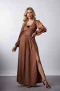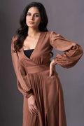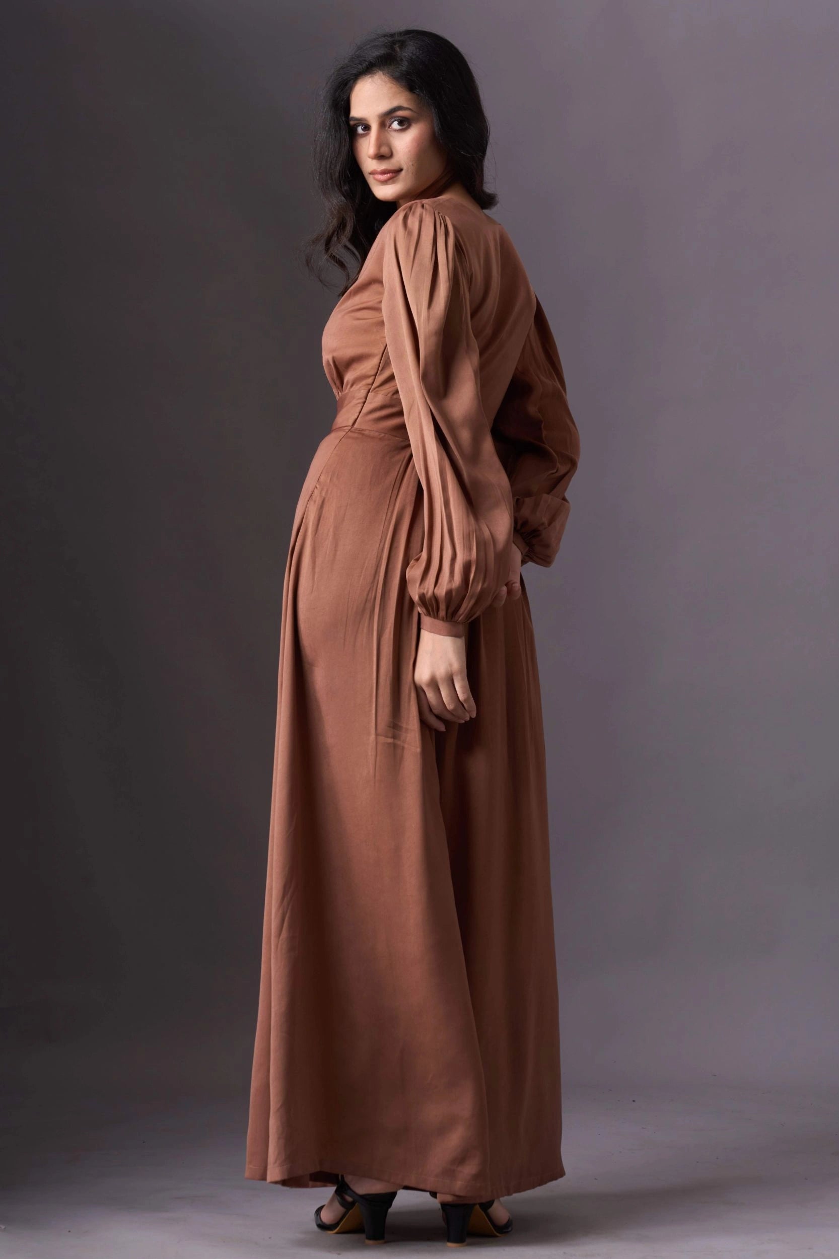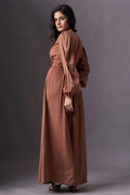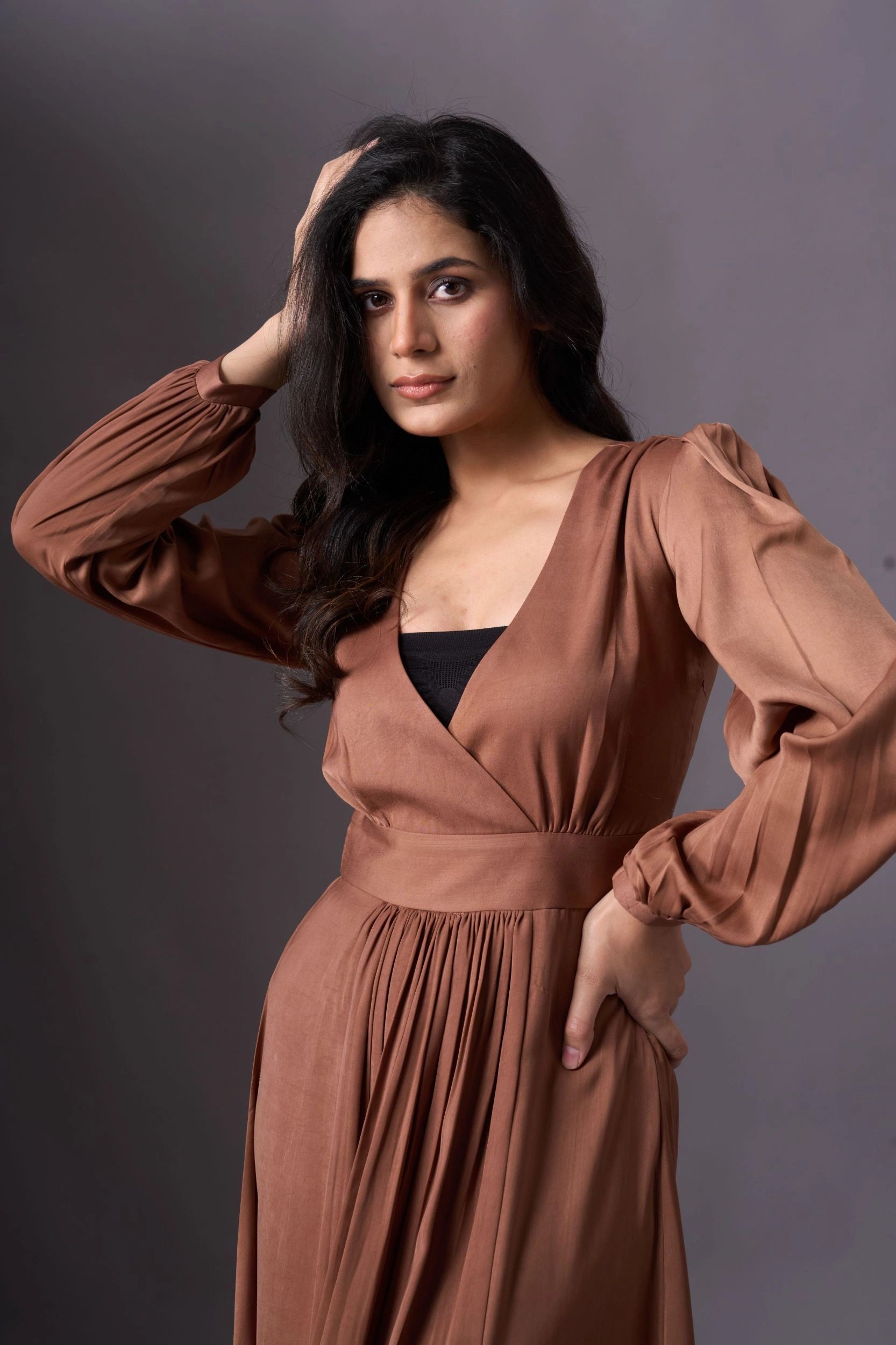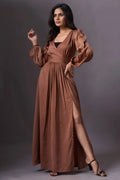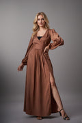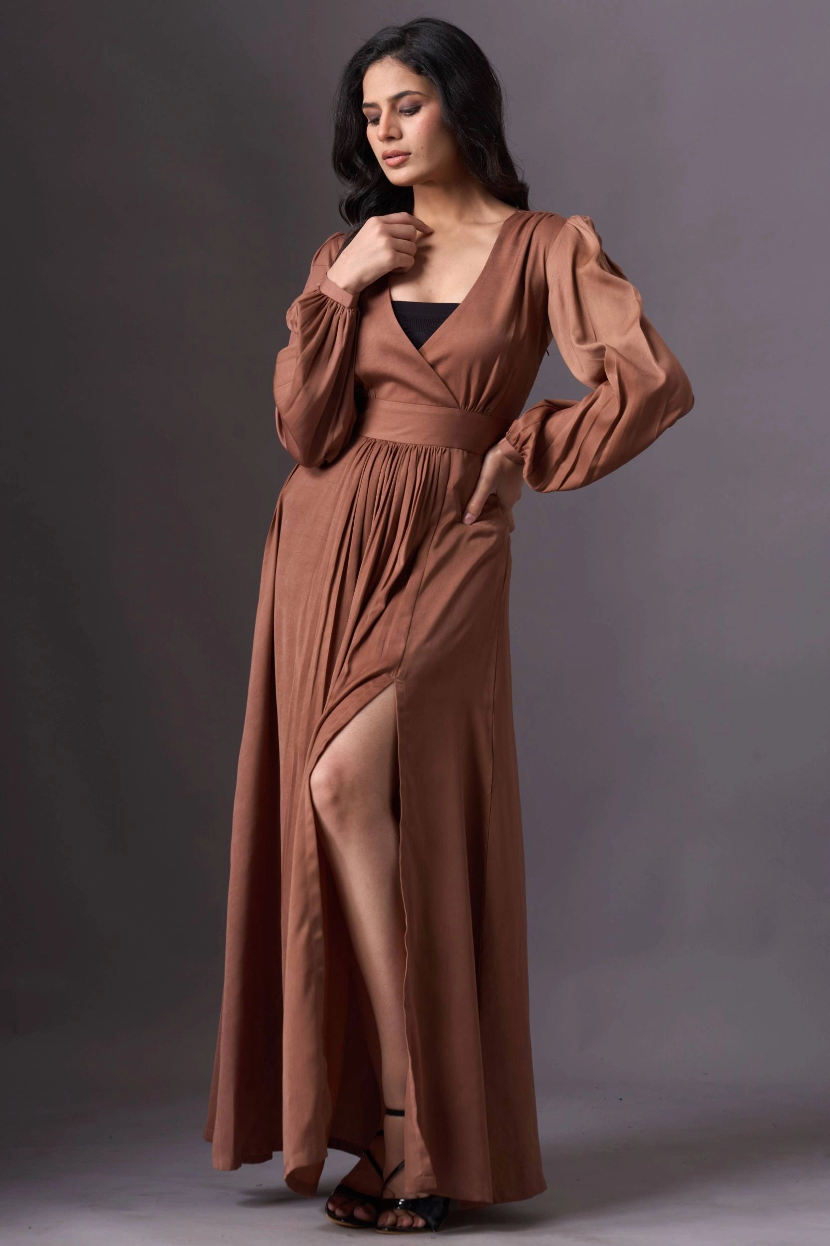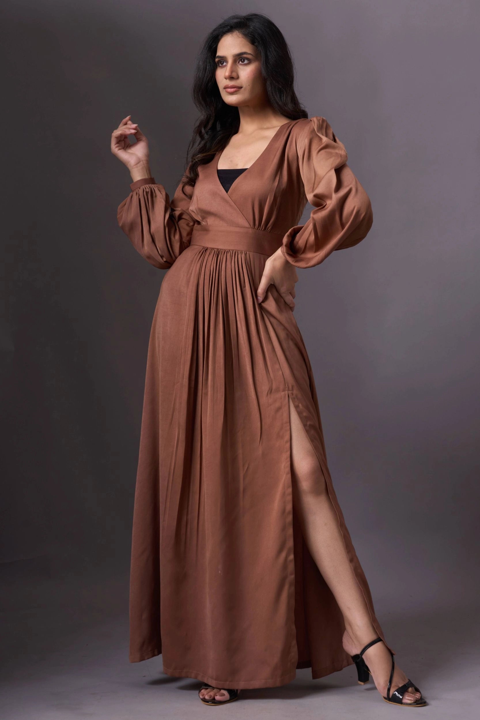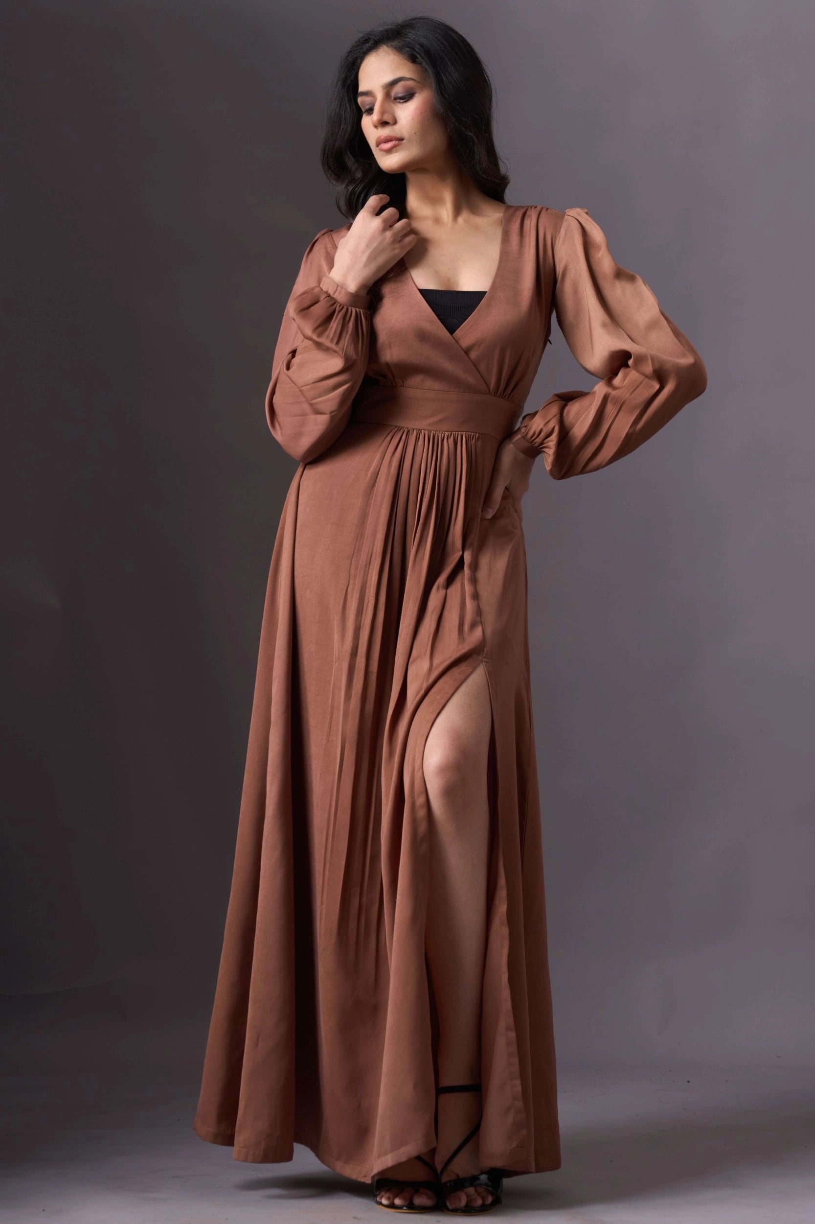 Introducing our Brown V-Neck Long-Sleeve Dress with High Slit, a stylish and elegant addition to your wardrobe. This dress features a deep V-neckline and long sleeves, offering a sophisticated look. The high slit on one side adds a touch of allure, while the knee-length design provides a flattering silhouette. Ideal for various occasions, this dress combines style and comfort effortlessly.