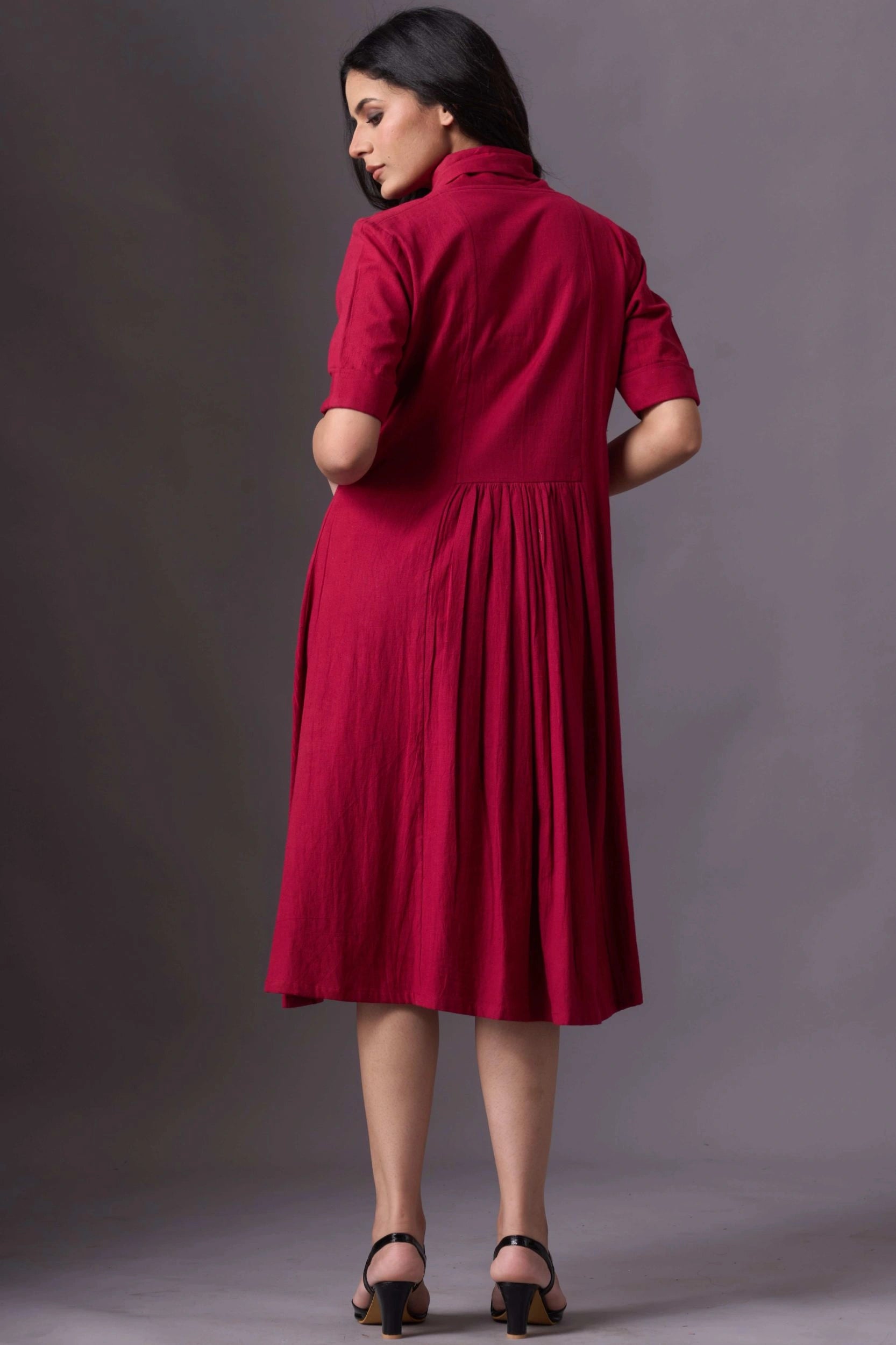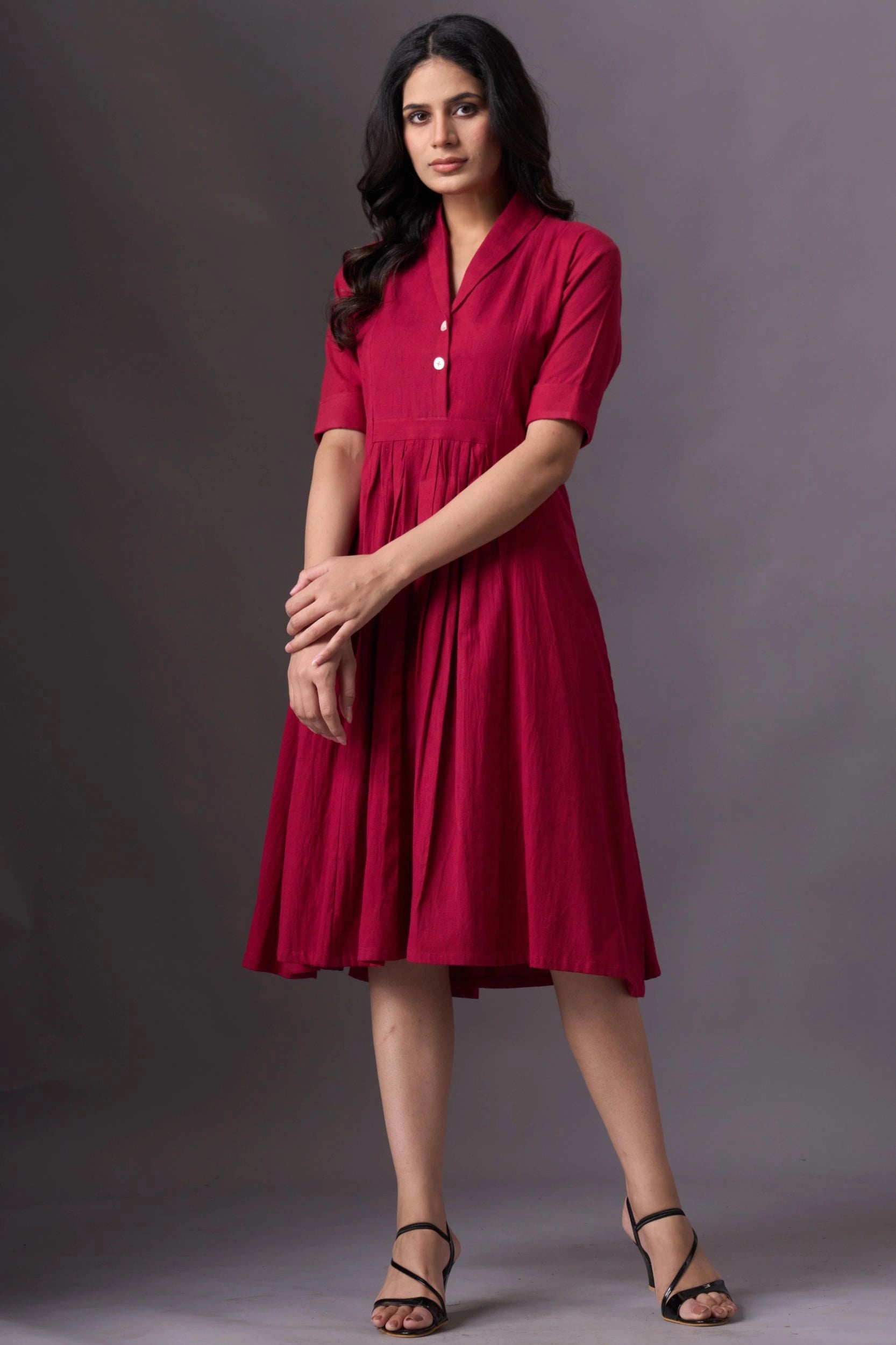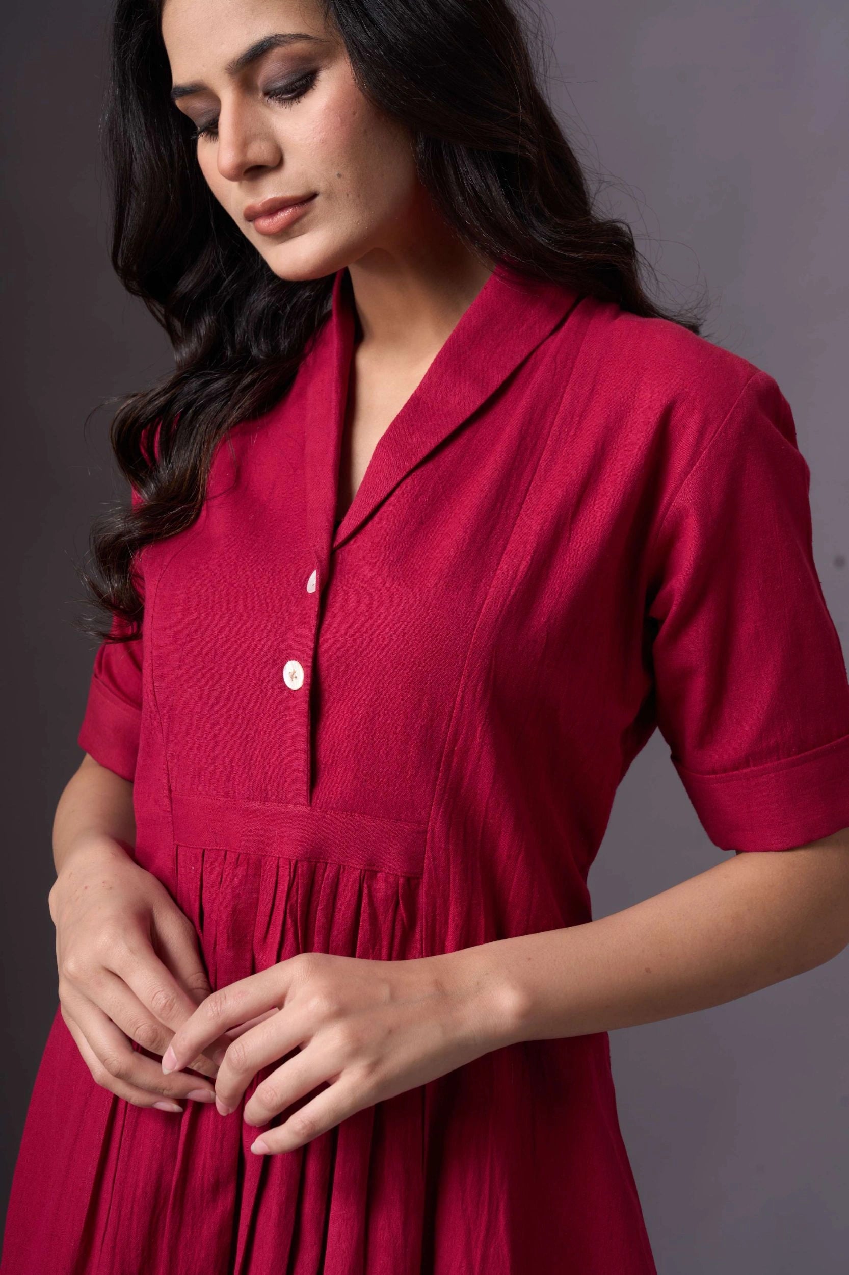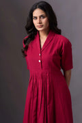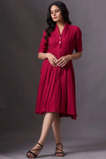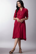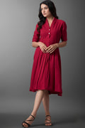 Introducing our Cherry Red V-Neck Dress with Pleats, a stylish and comfortable addition to your wardrobe. This knee-length dress features short Elbow sleeves and a flattering V-neckline with three buttons. The pleats starting from the waist add a touch of elegance, making it perfect for casual outings or relaxed gatherings.