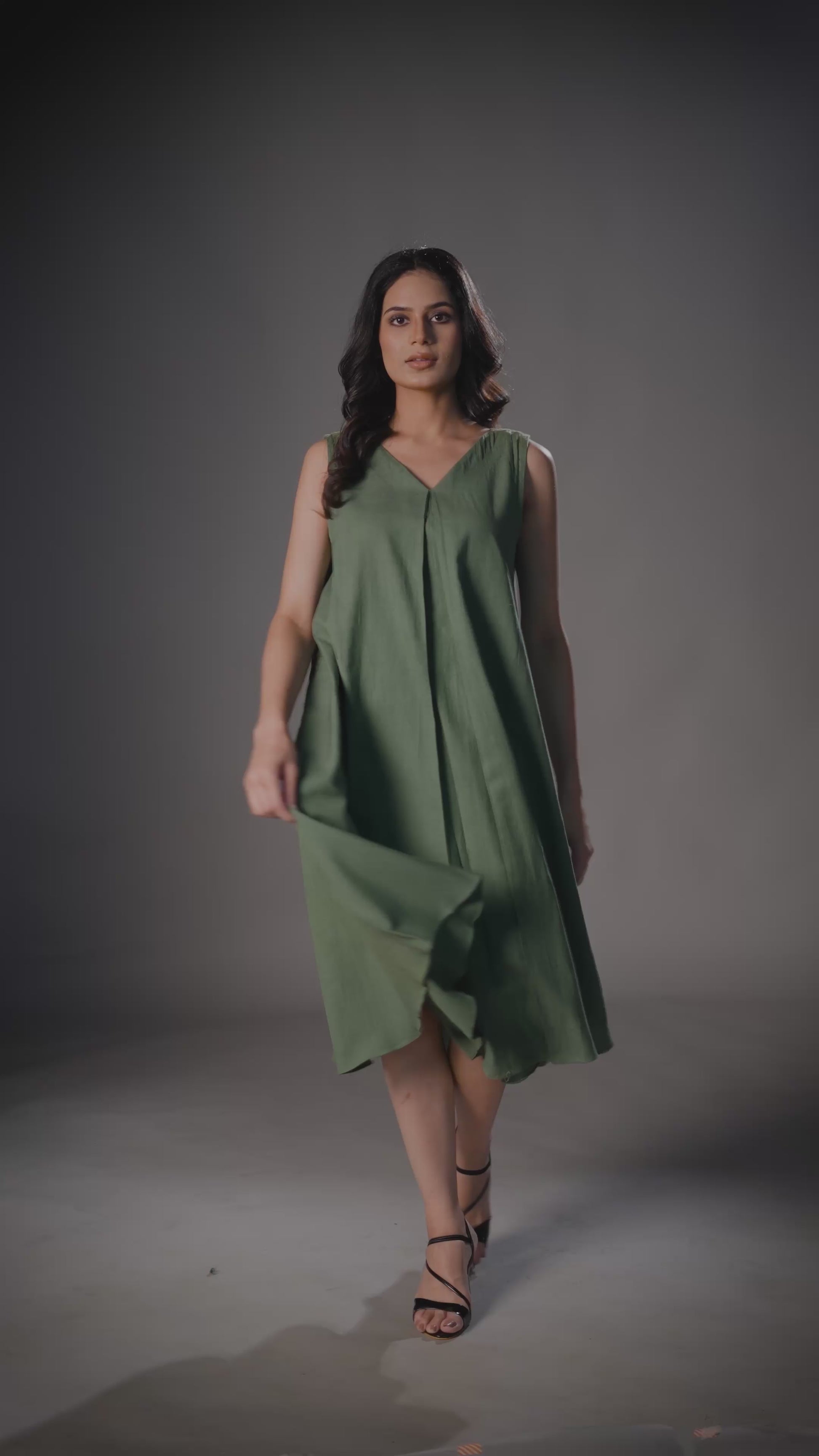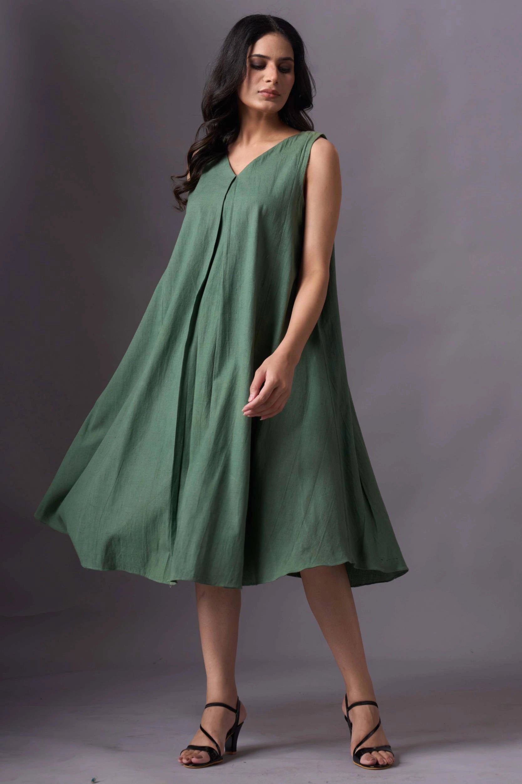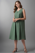 Introducing our Green Sleeveless V-Neck Dress, a perfect blend of elegance and comfort. This knee-length dress features a chic V-neckline and a loose, flowing fit. The pleated skirt adds volume and movement, making it ideal for casual and semi-formal occasions.