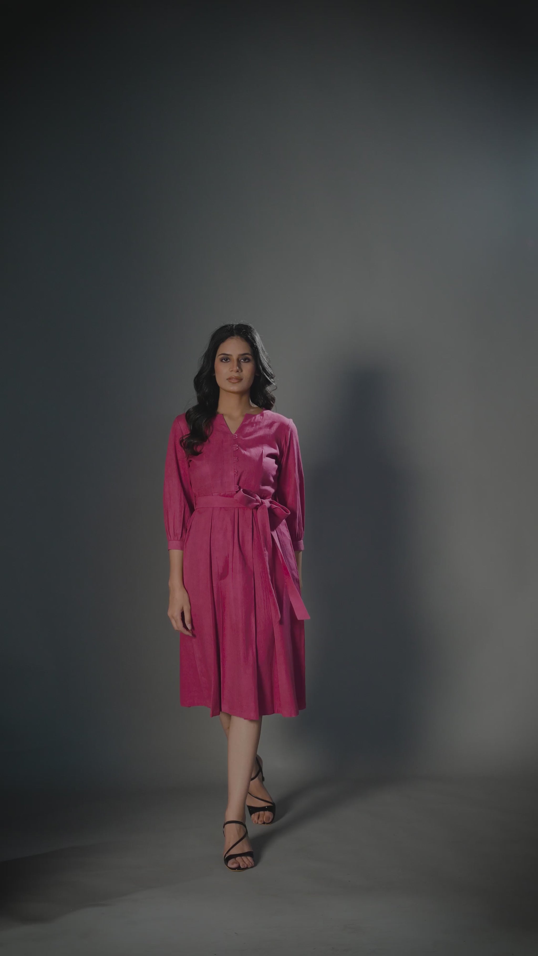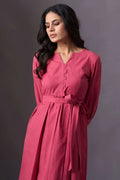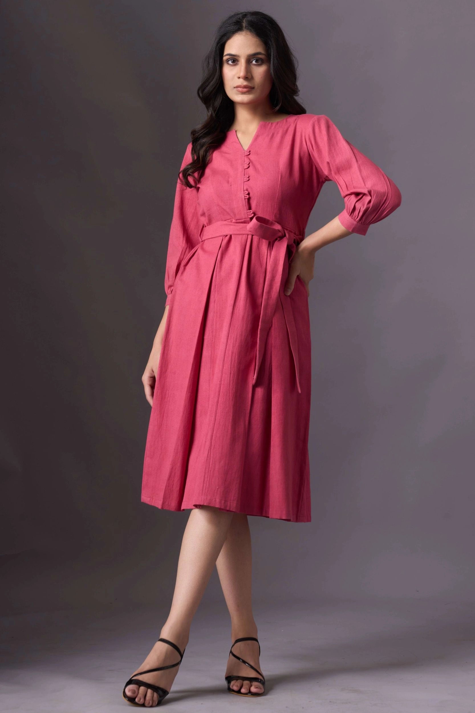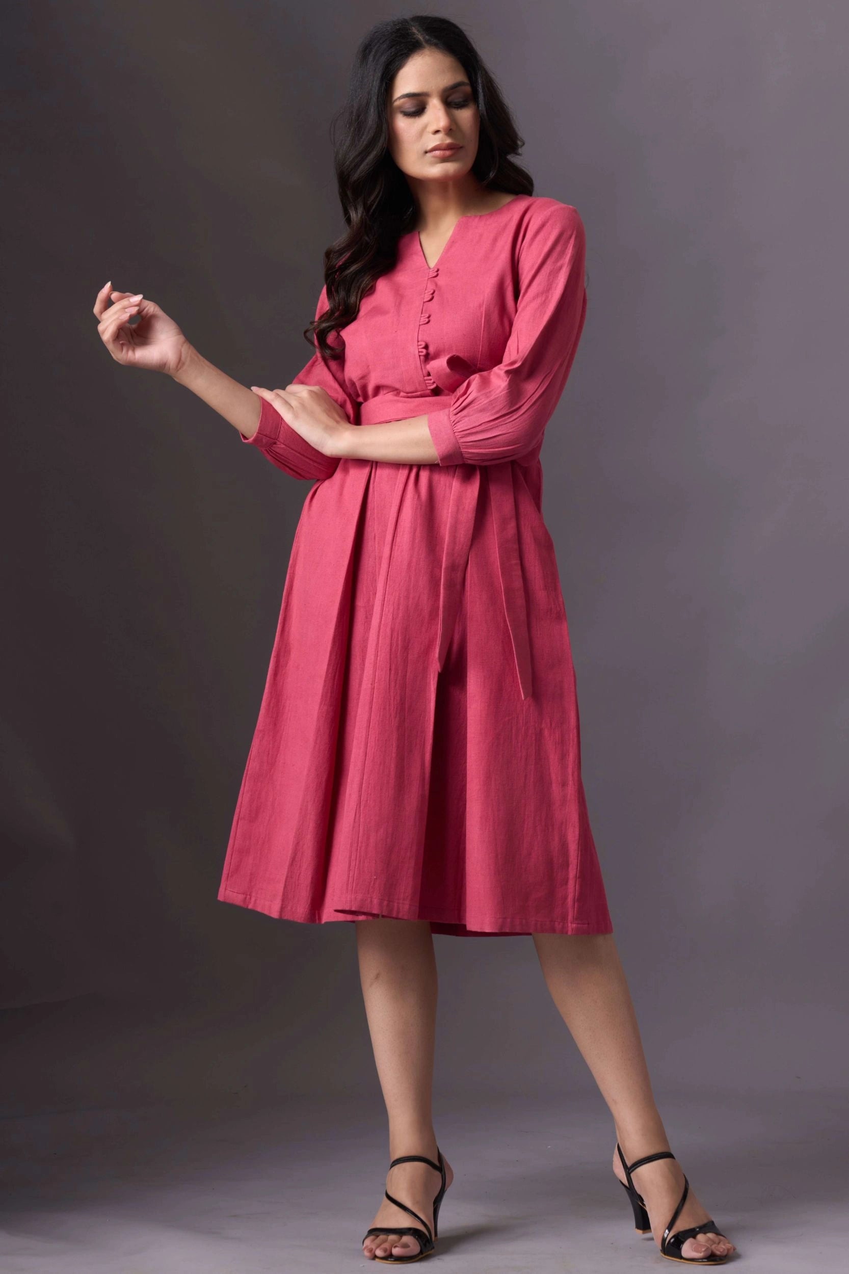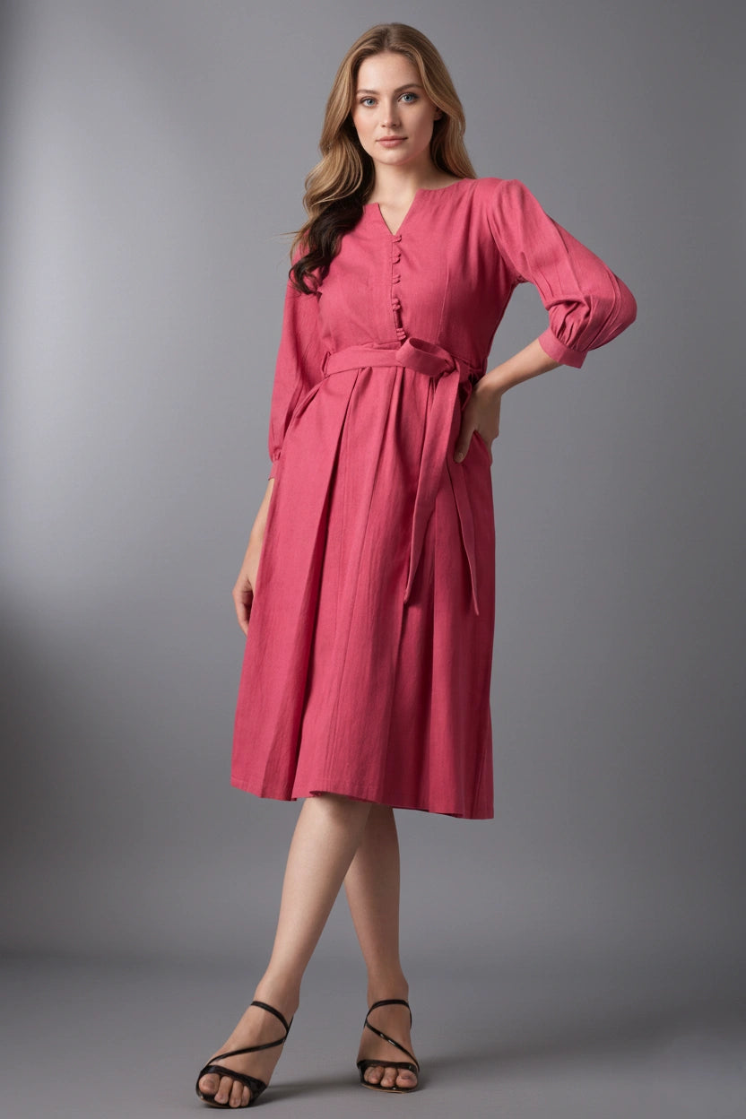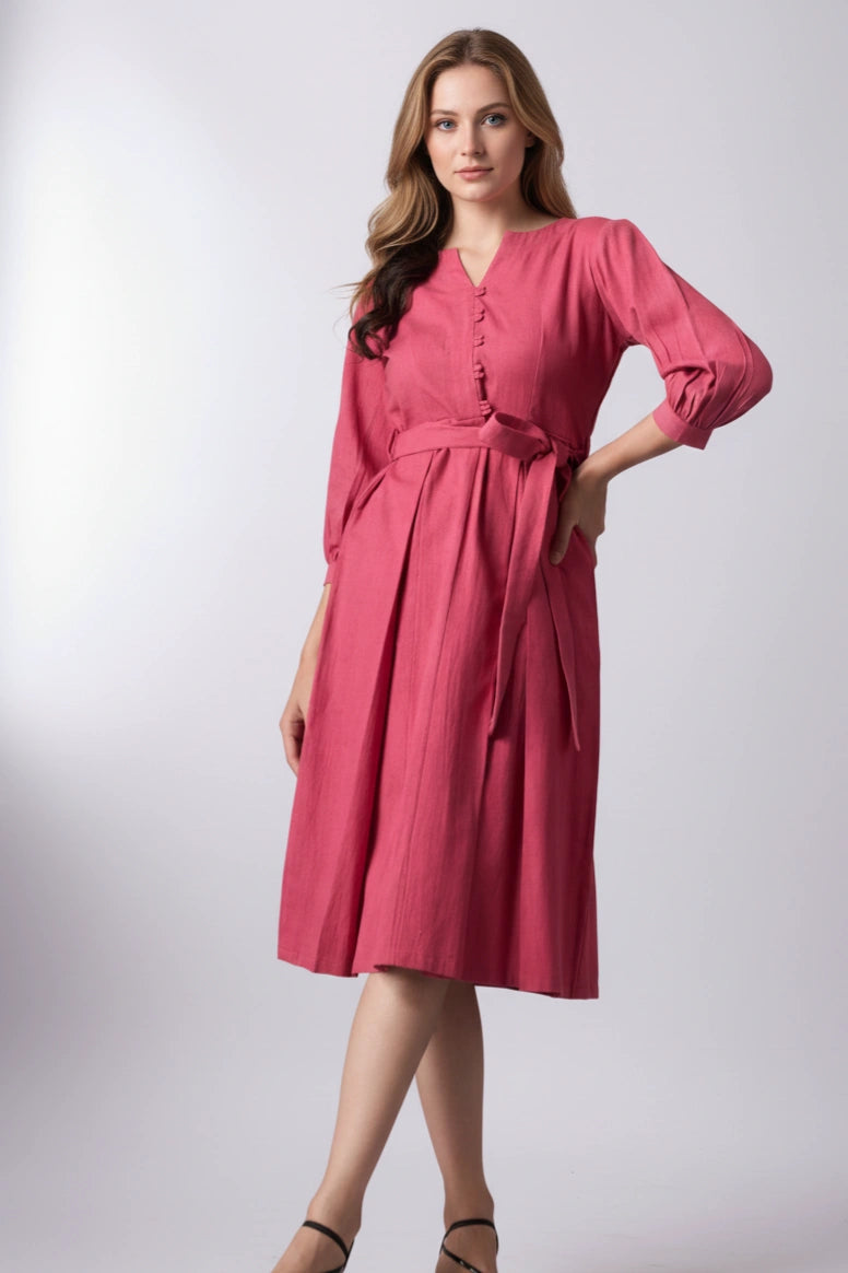 Introducing our Dusty Pink V-Neck Button-Down Dress, a chic blend of comfort and style. This mid-calf dress features a V-neckline, button-down front, and a belt tied at the waist for a flattering silhouette. The three-quarter length sleeves add a touch of elegance, making it perfect for any semi-formal occasion.