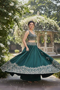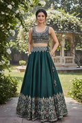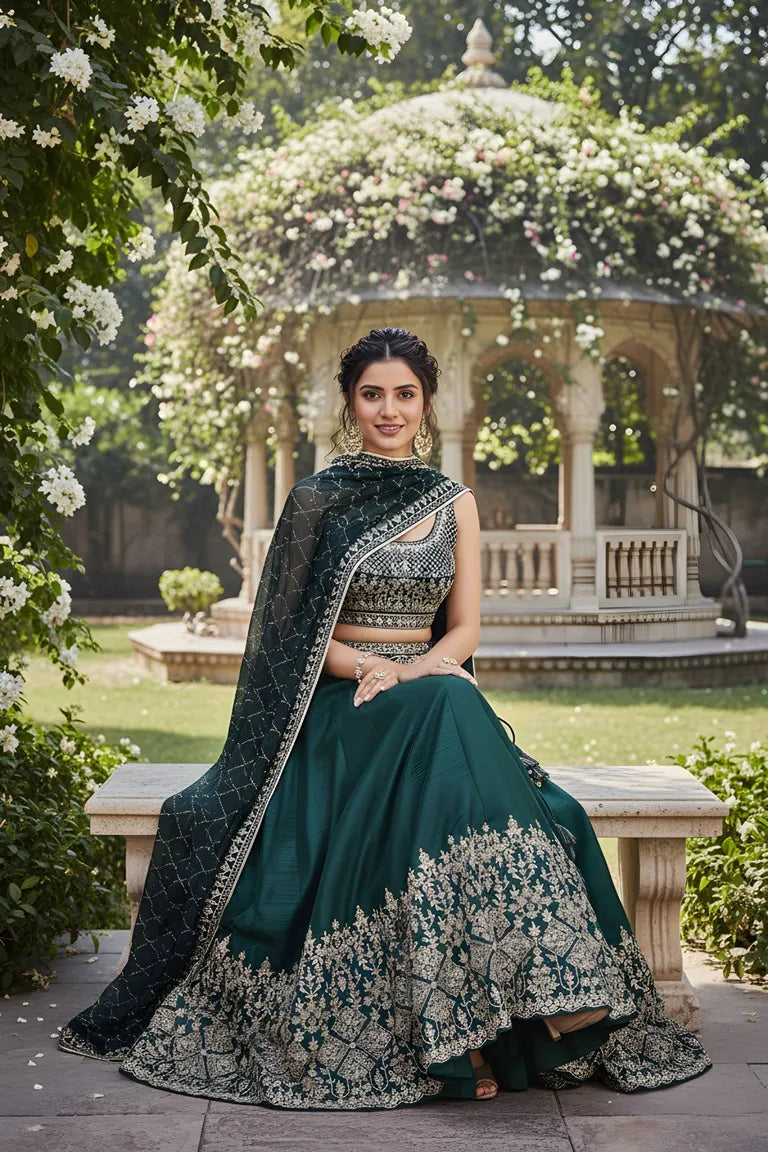 The rich forest green skirt, the intricate gold embroidery, and the stunning embellished blouse—every detail of this lehenga is a masterpiece. Ready for the celebration!