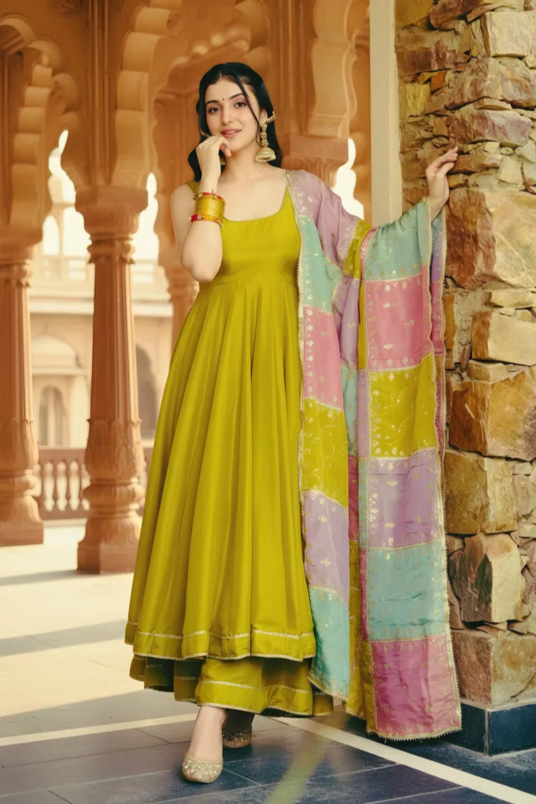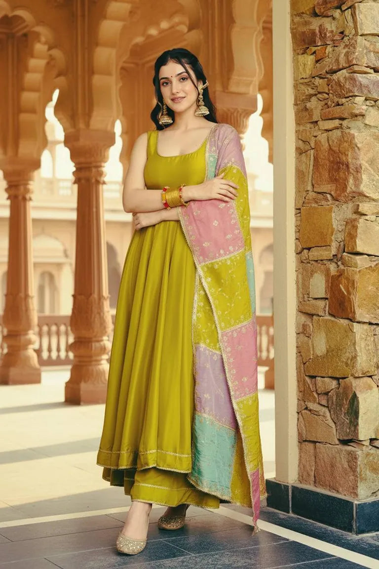 Elegance meets tradition — Mehndi color paired with a beautifully embroidered multi-tone dupatta, perfect for festive celebrations or a graceful evening affair.