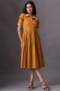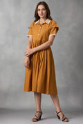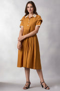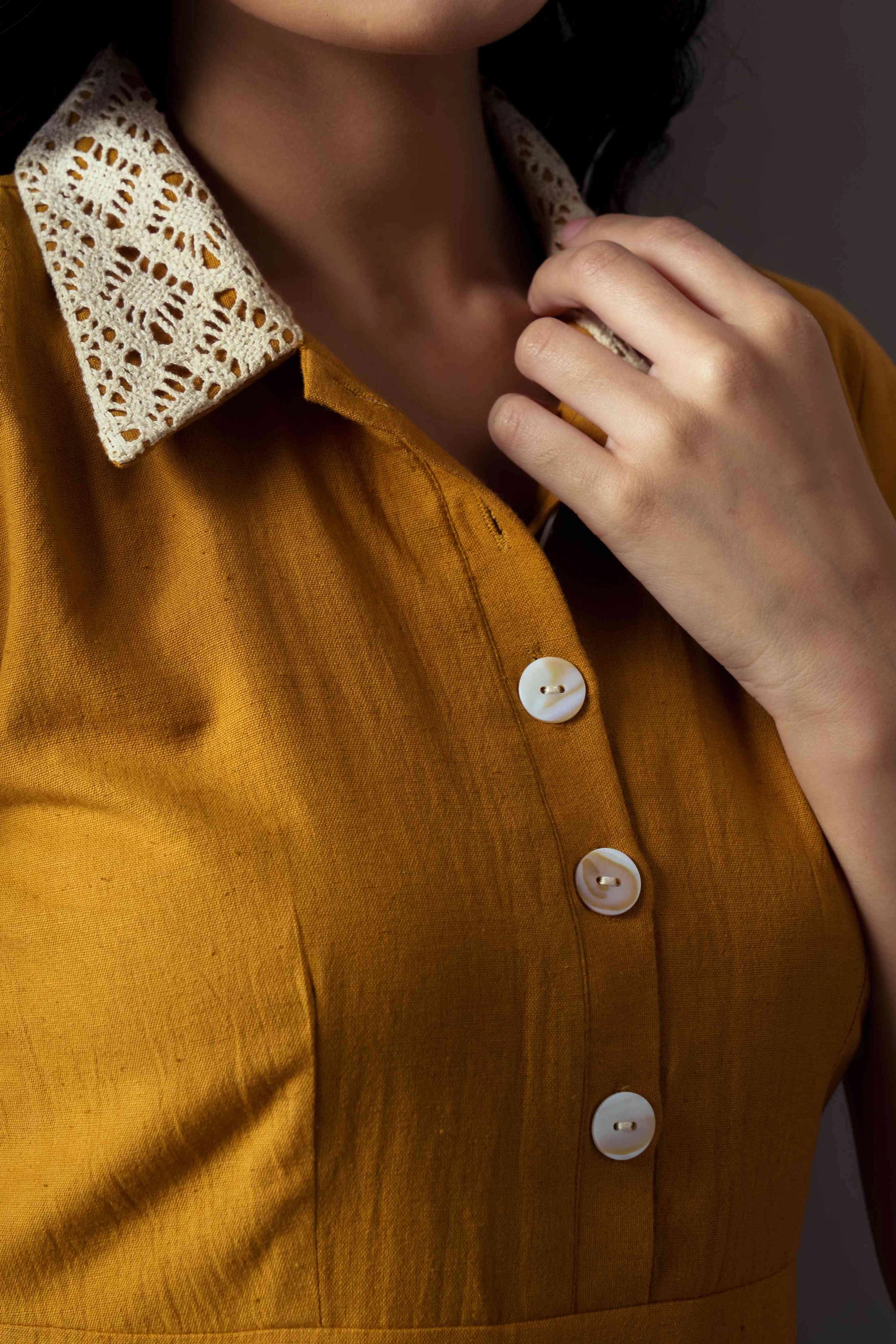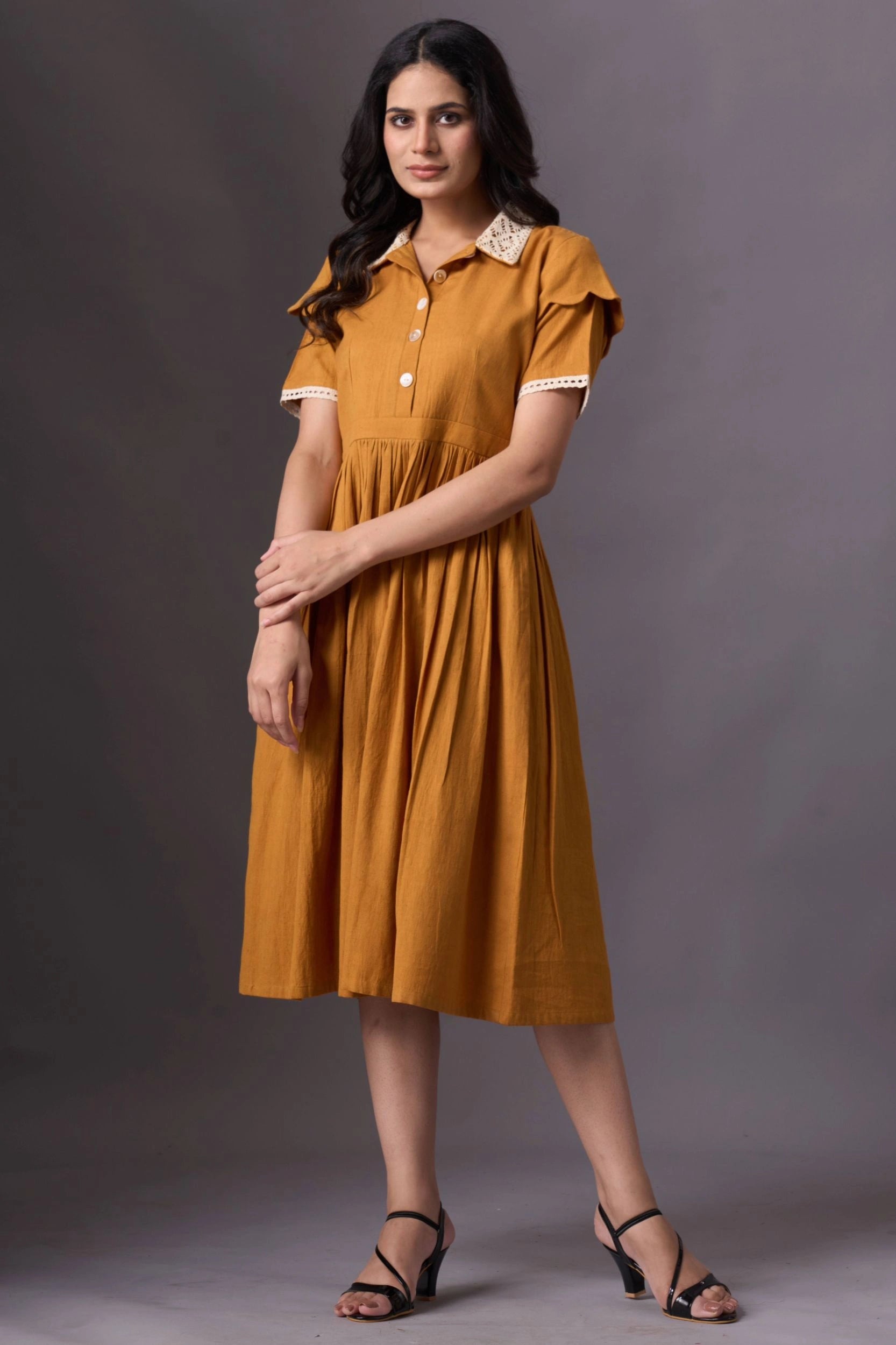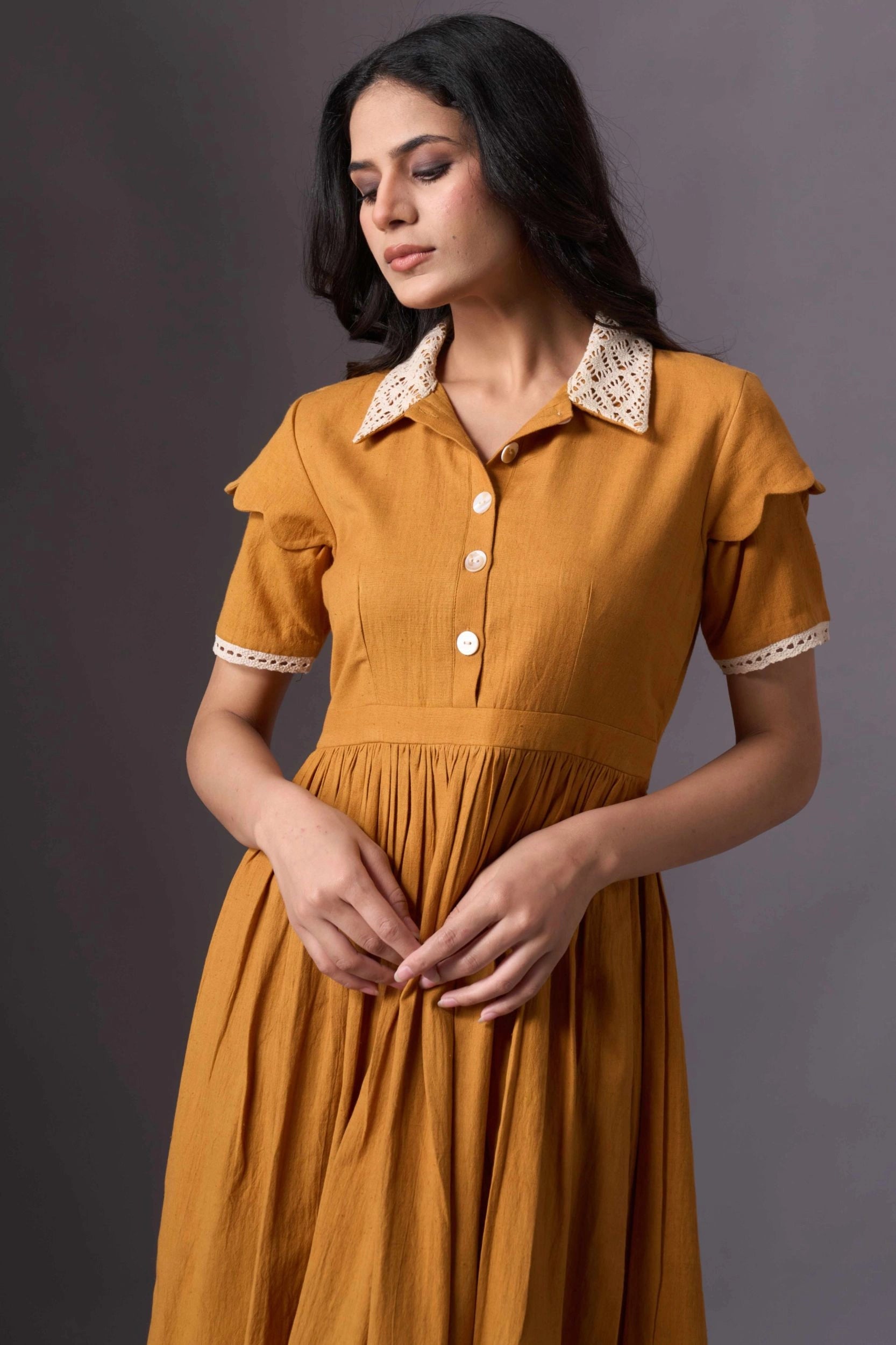 Introducing our Mustard Yellow Lace Trim Dress, an exquisite blend of vintage charm and modern style. This knee-length dress features a fitted bodice that gracefully flares into a gathered skirt. The short sleeves and white lace collar, along with the lace trim on the sleeves, add a touch of elegance. Crafted from lightweight and comfortable fabric, this dress is perfect for any semi-formal occasion.