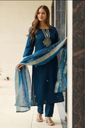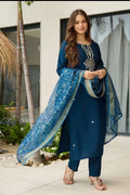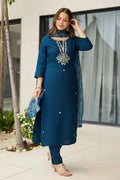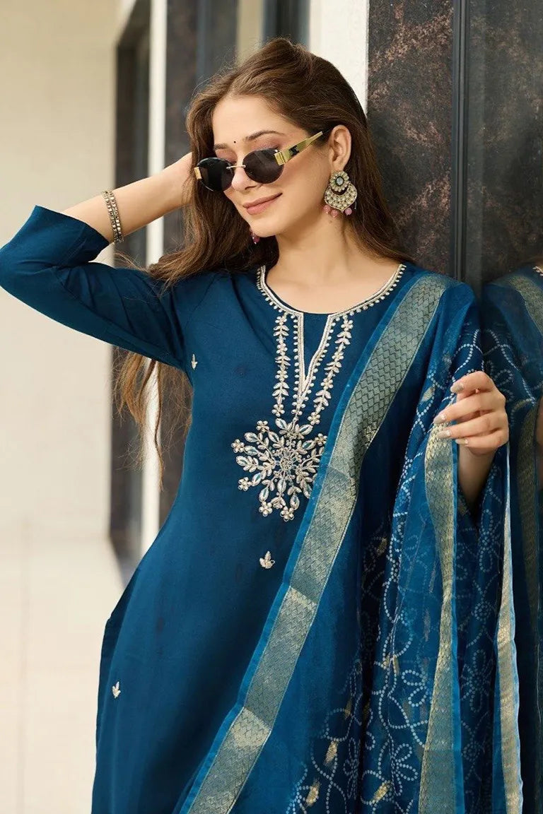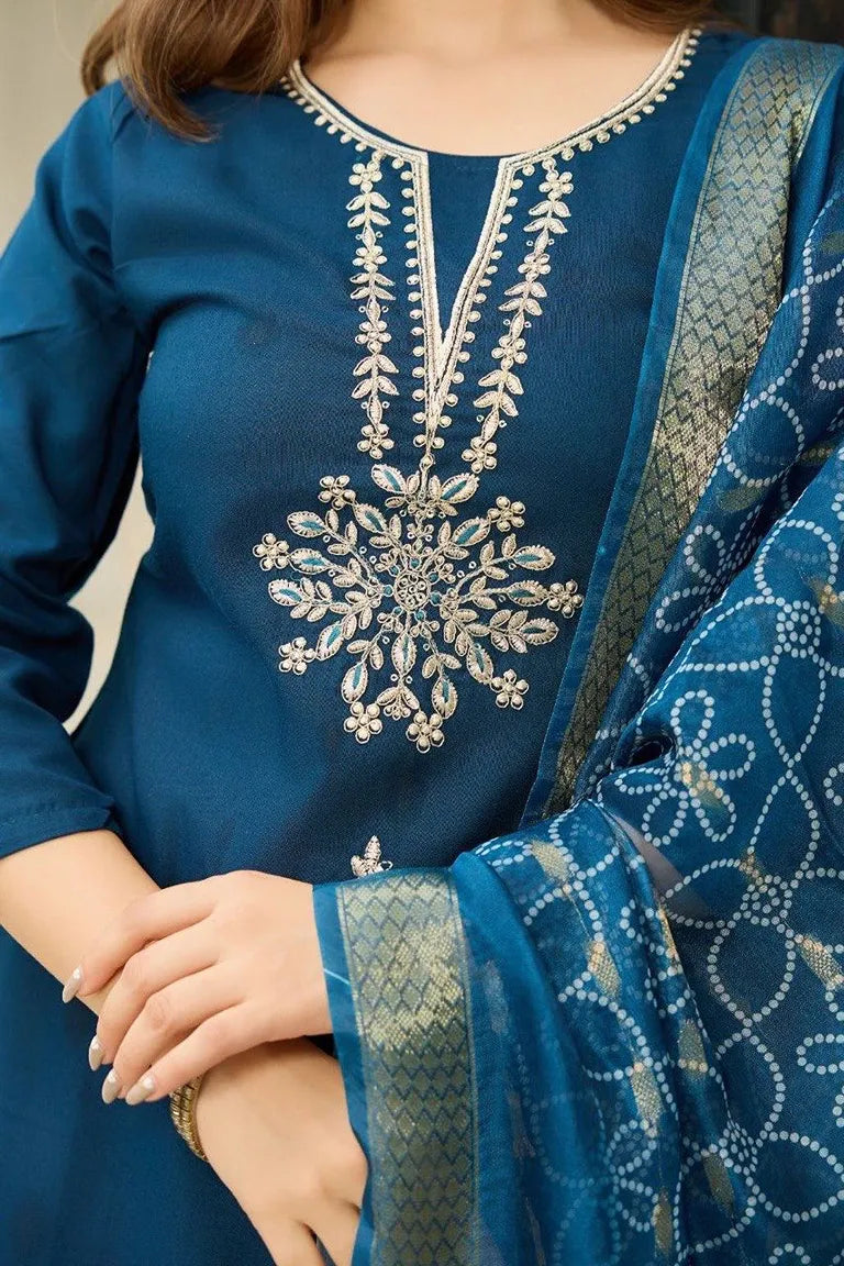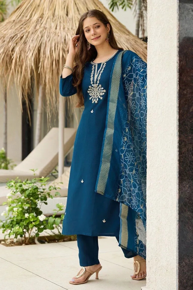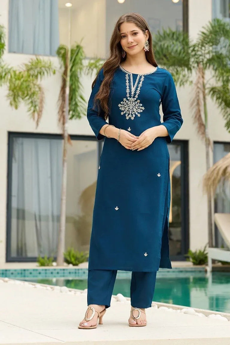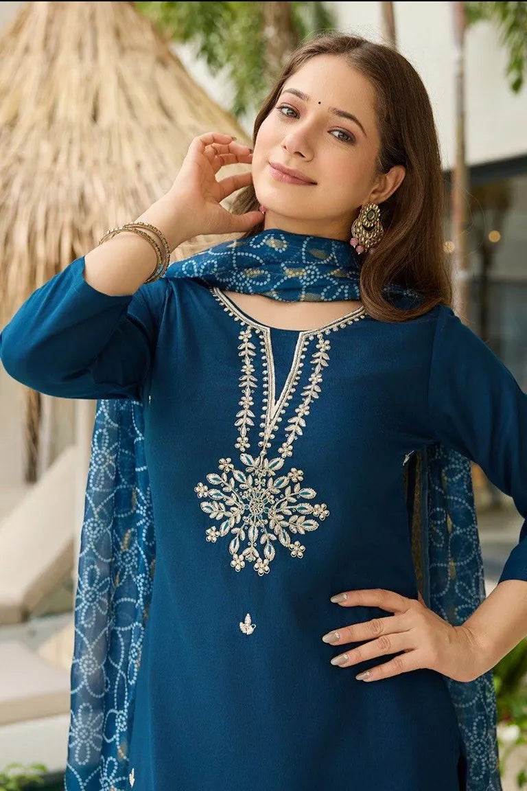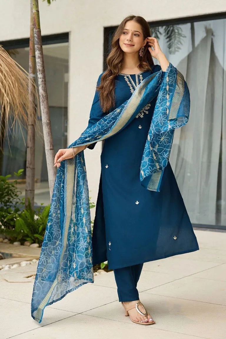 Women's Rayon Embroidered Straight Kurta with Pant And Dupatta Sets