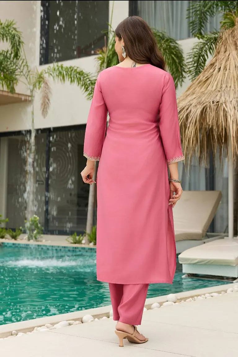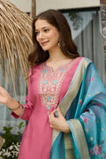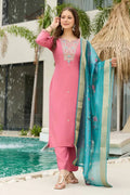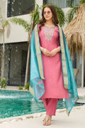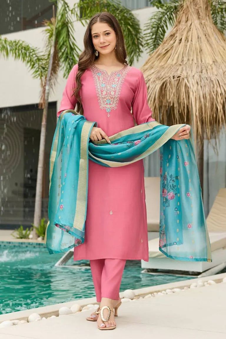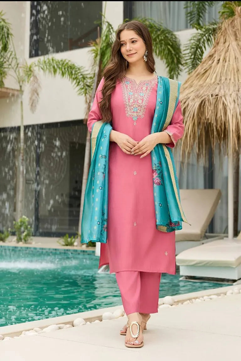 Women's Viscose Silk Embroidered Straight Kurta with Pant and Dupatta Sets
