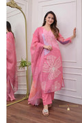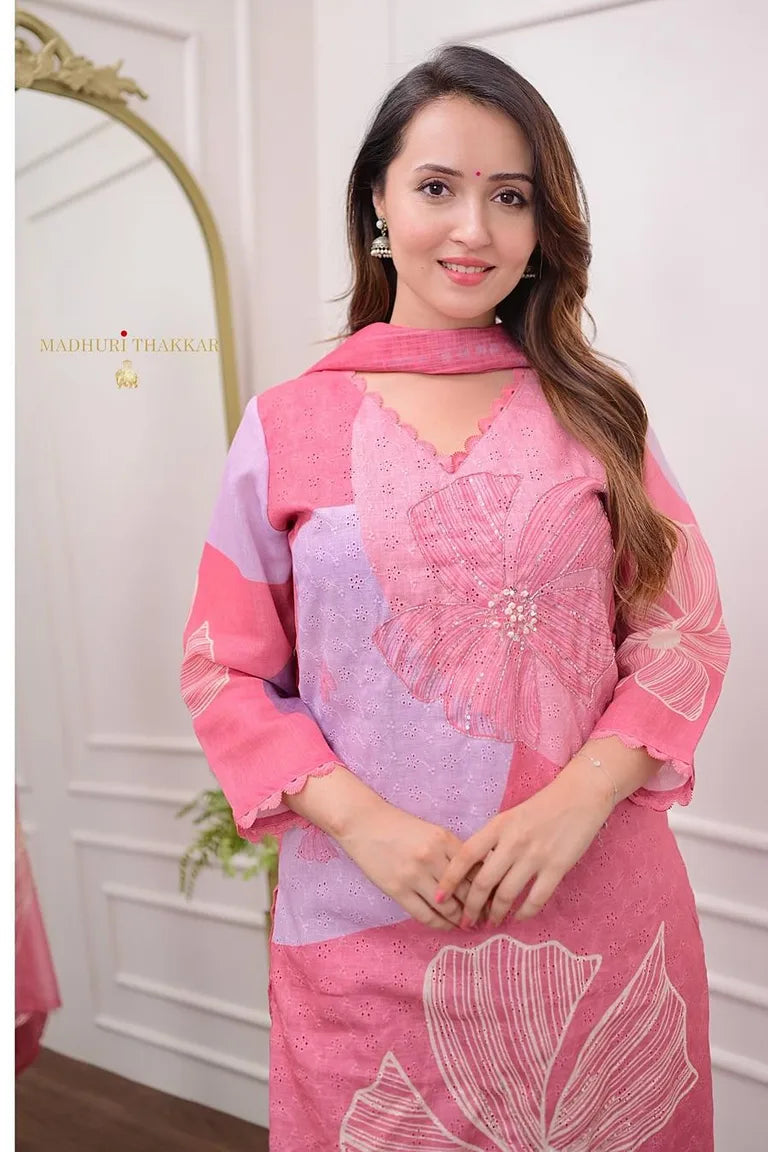 Featuring beautiful Heavy Suit Set which is beautifully decorated with intricate hand embroidery, Zari weaving and prints. It is paired with matching pants and Lace dupatta.