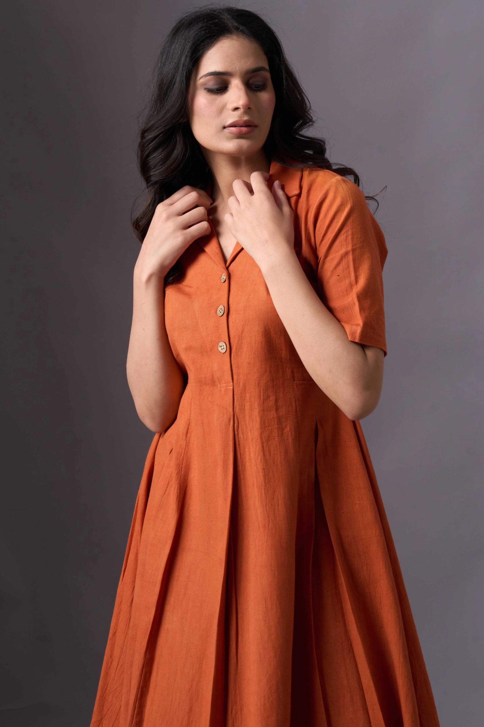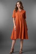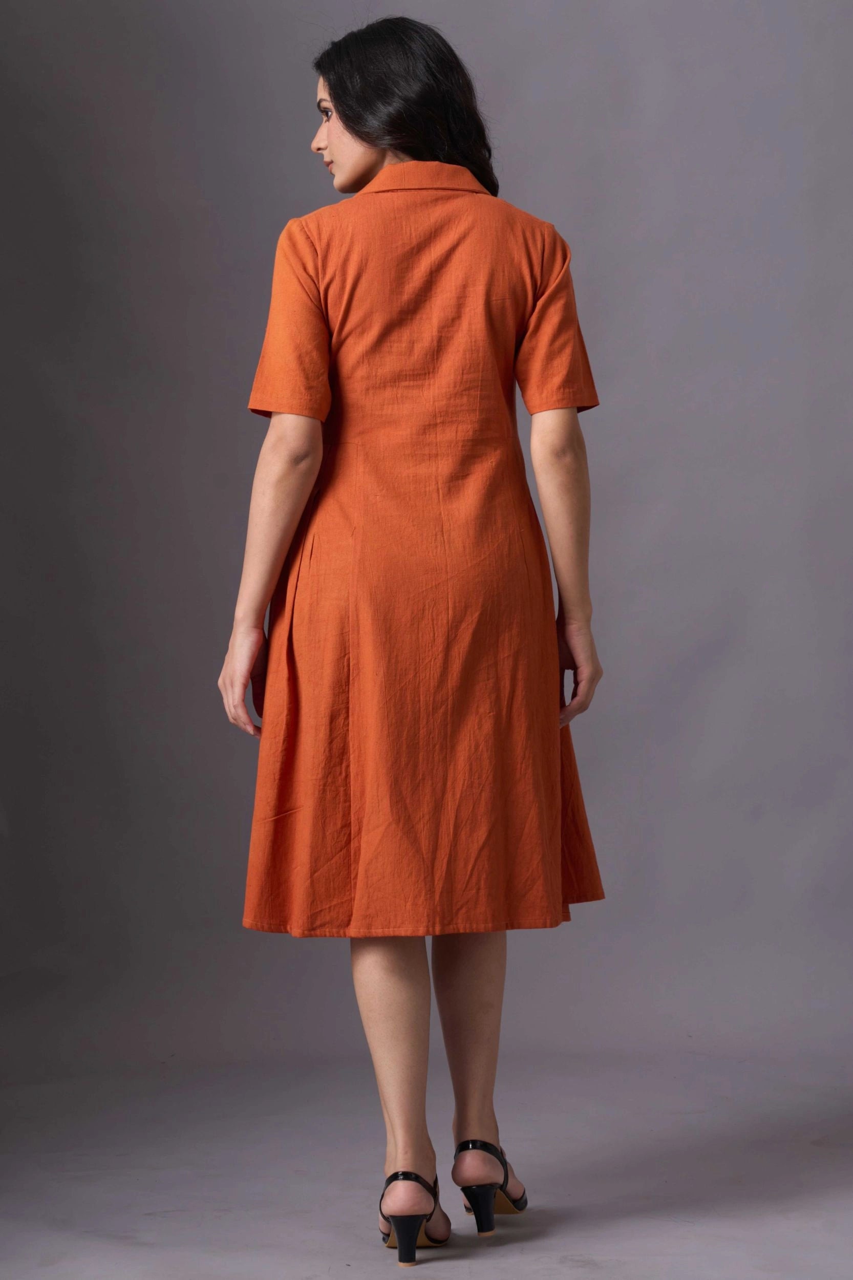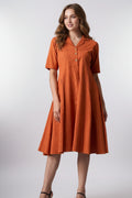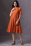 Introducing our Rust Orange Collared Button-Down Flare Dress, a perfect blend of elegance and comfort. Made from a lightweight fabric, this knee-length dress features a chic collar, short sleeves, and a button-down front. The flared skirt adds a touch of sophistication, making it ideal for both casual and semi-formal occasions.