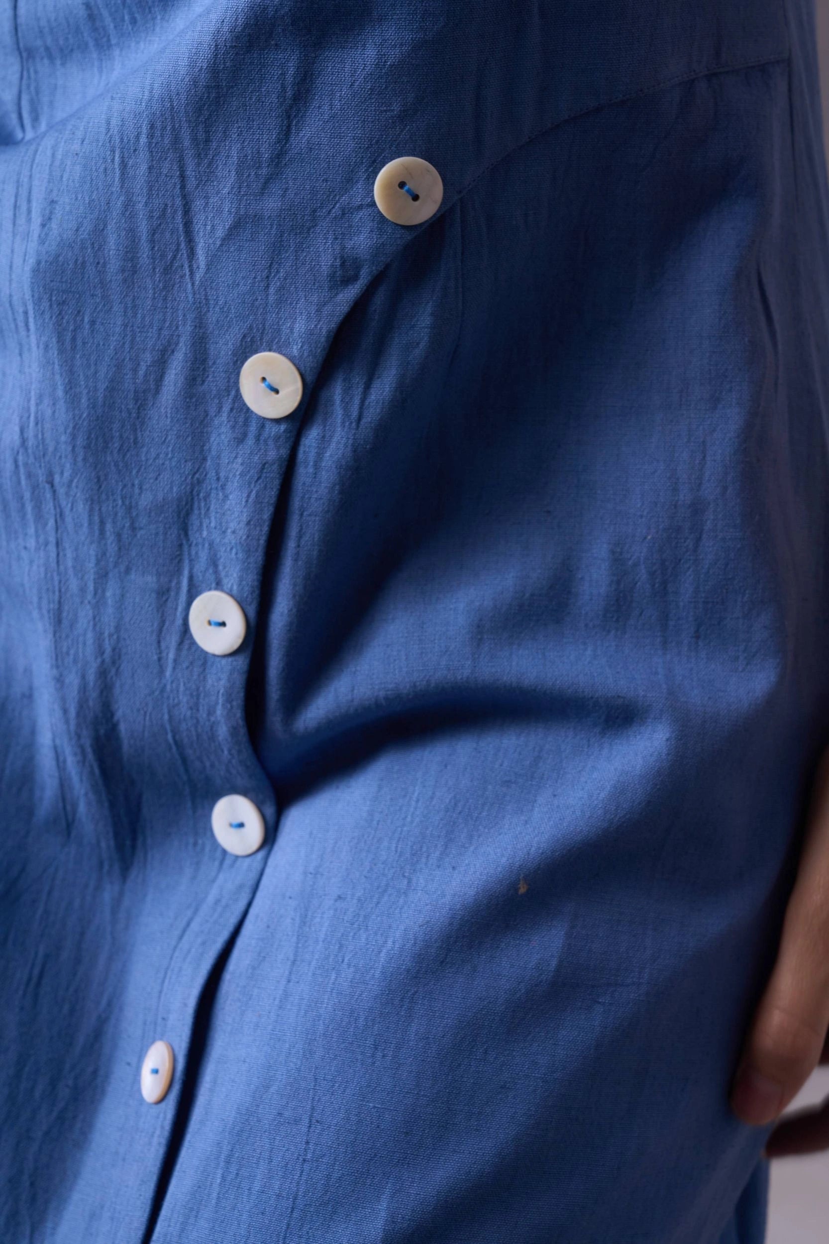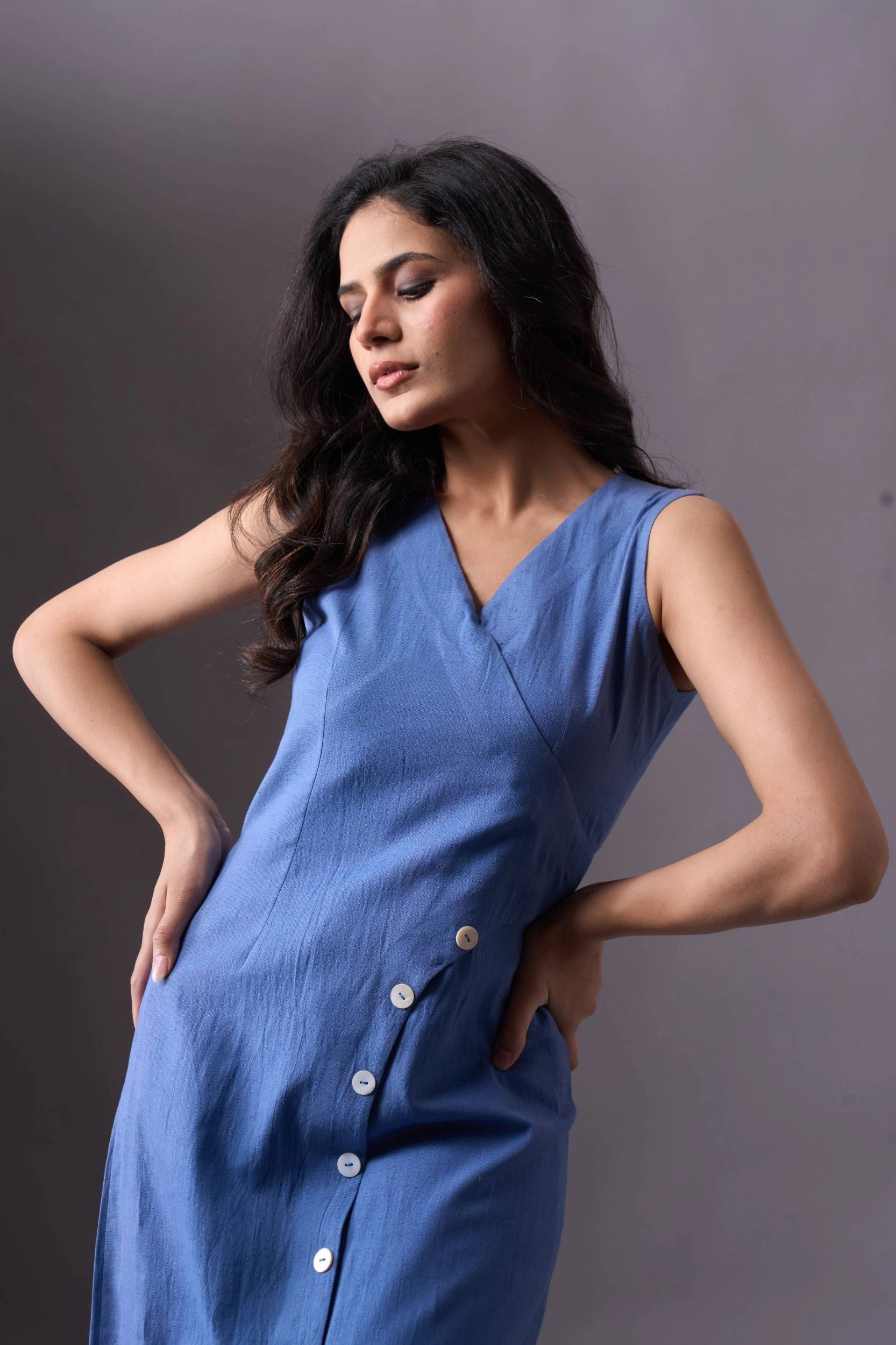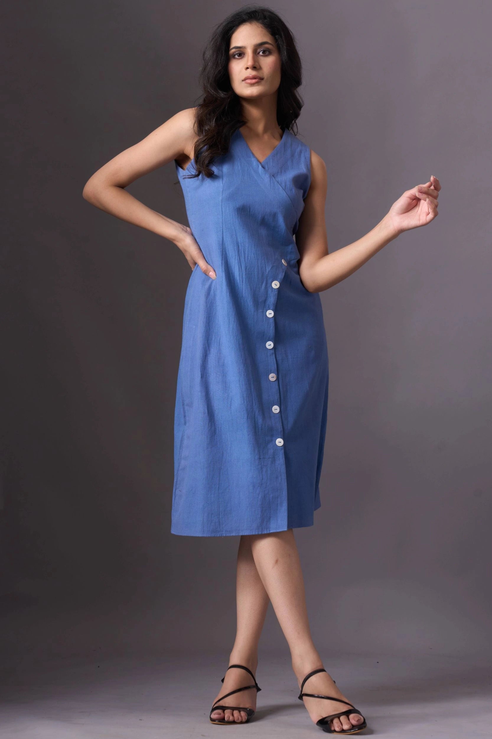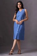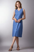 Introducing our Sky Blue Sleeveless V-Neck Dress with Buttons, a chic and stylish addition to your wardrobe. This dress features a V-neckline and a row of white buttons that run diagonally from the waist to the hem on the left side. The sleeveless design and knee-length fit offer both elegance and comfort, making it perfect for various occasions.