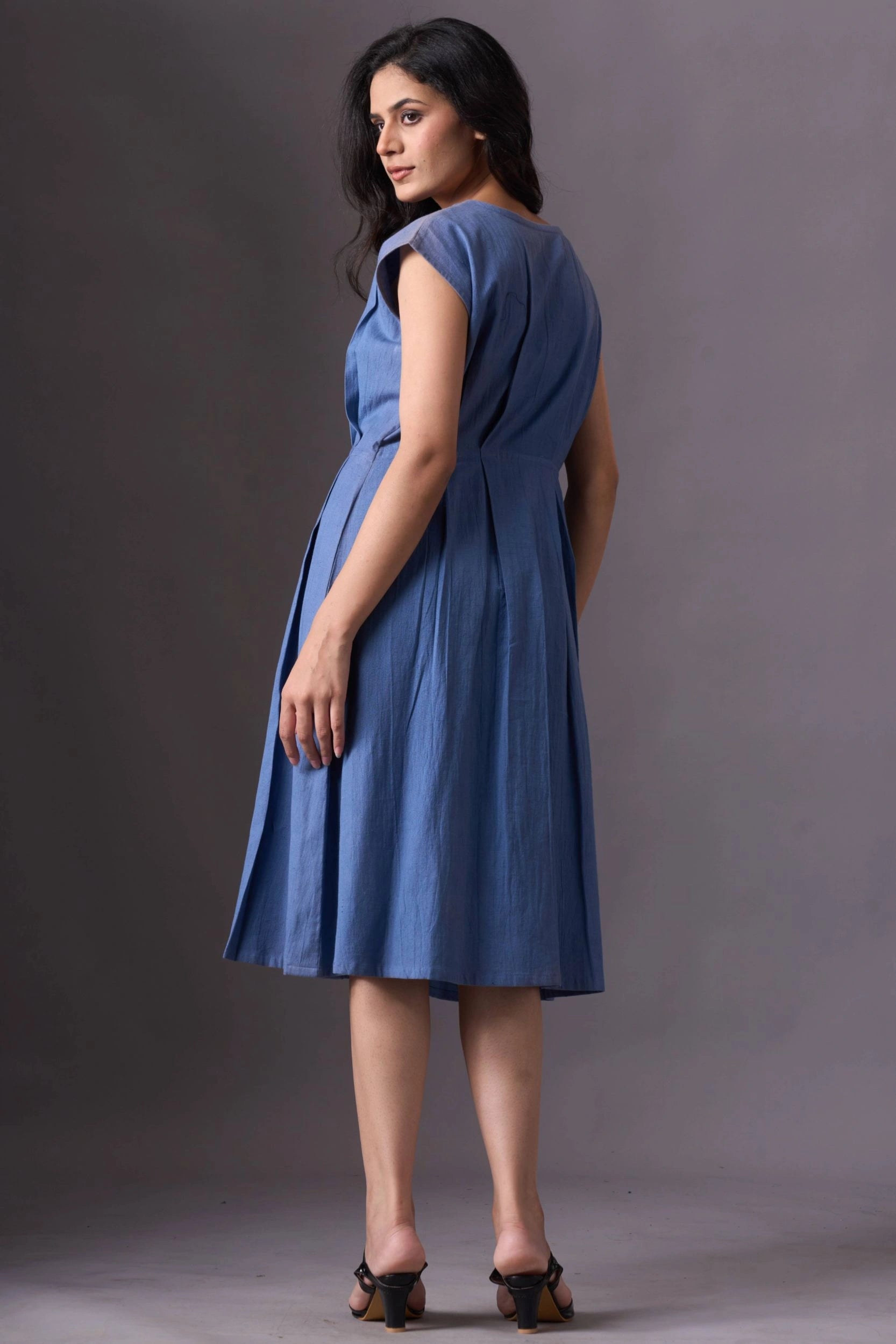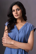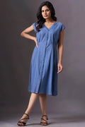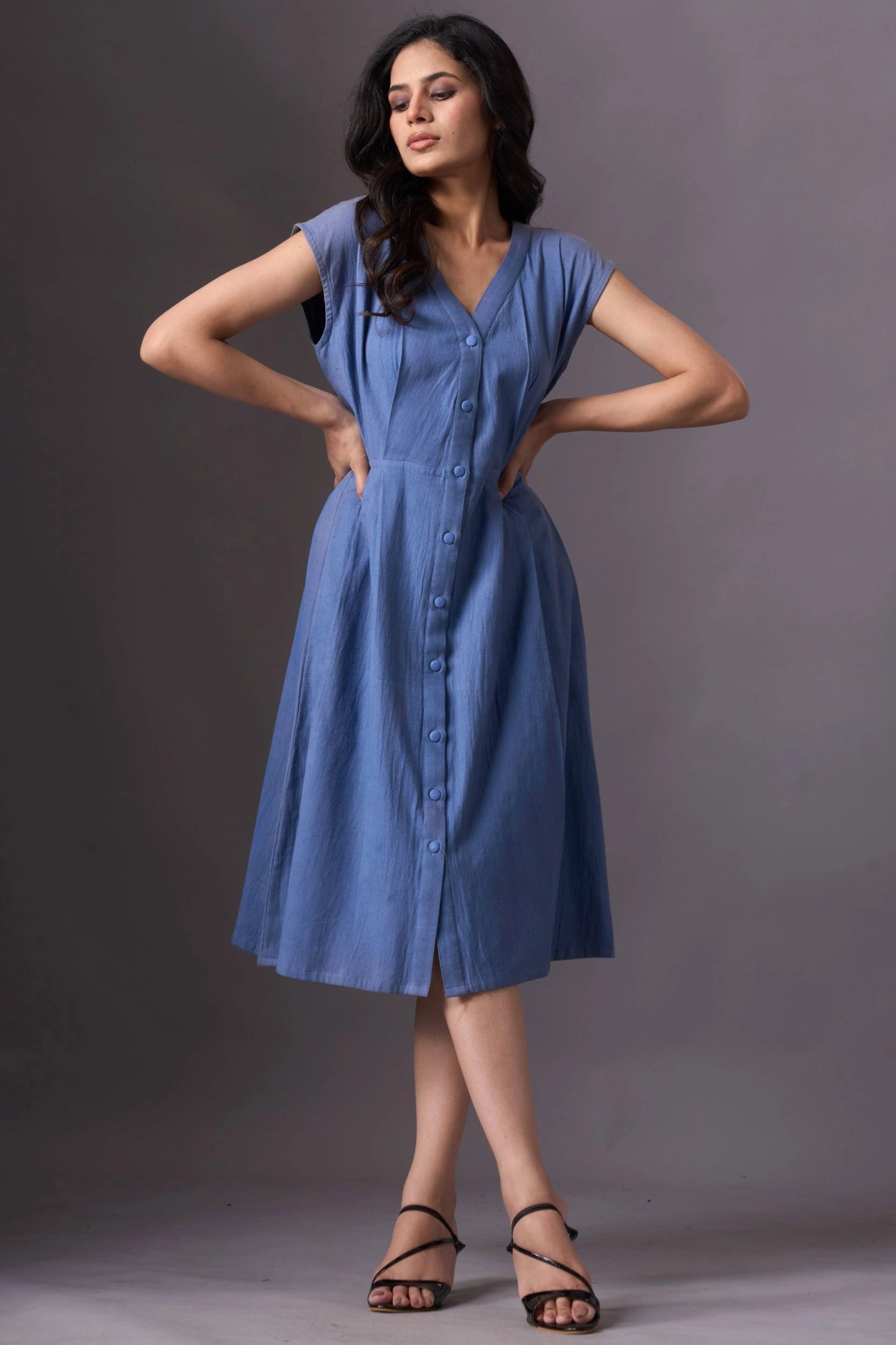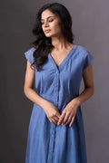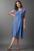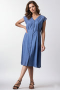 Introducing our Sky Blue Button-Down V-Neck Dress with Short Cap Sleeves, a chic and comfortable addition to your wardrobe. This dress features a V-neckline with button-down front, adding a touch of sophistication. The loose, flowing fit and knee-length design offer both elegance and ease. Perfect for various occasions, this dress is sure to be a favorite.
