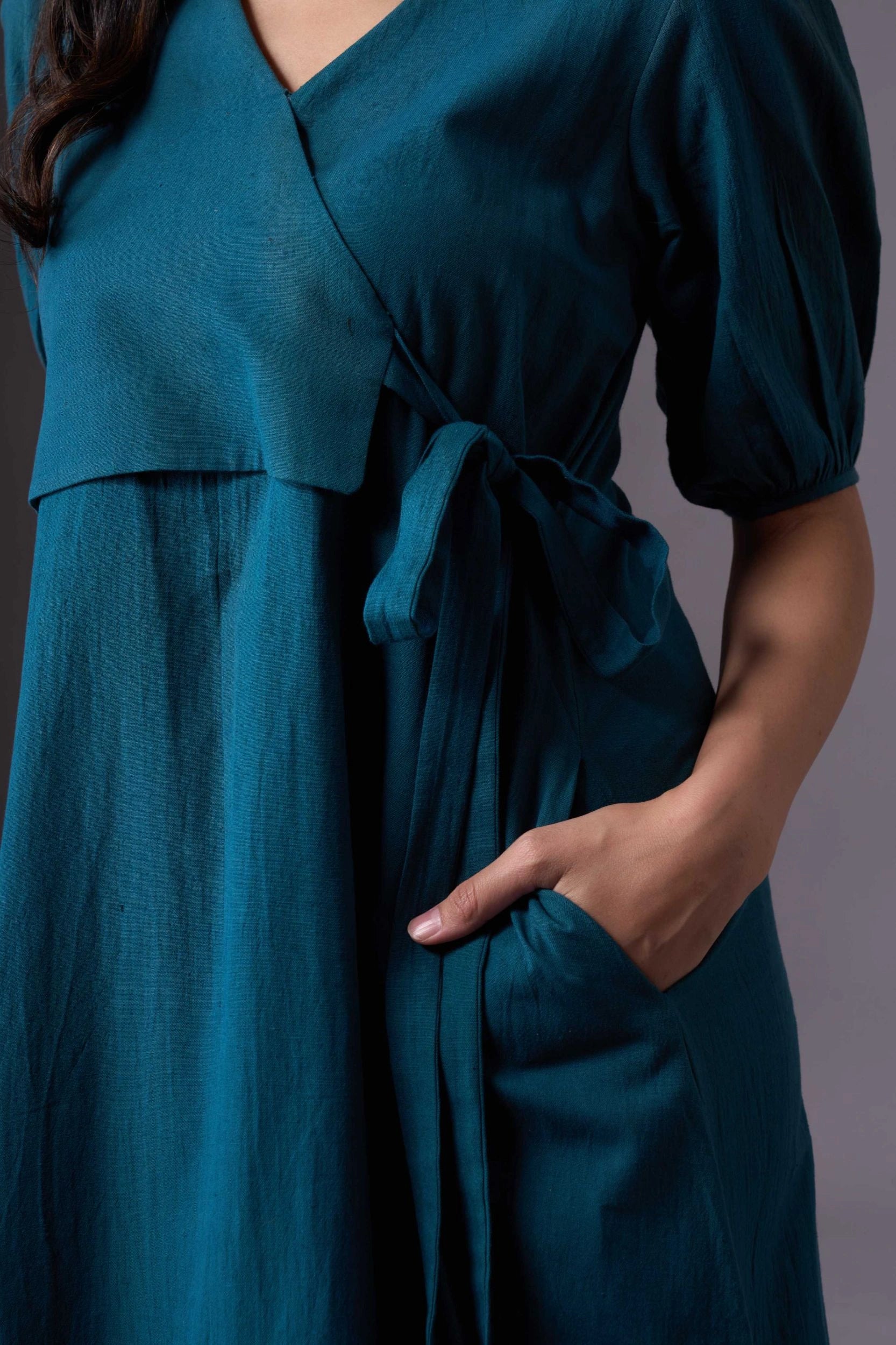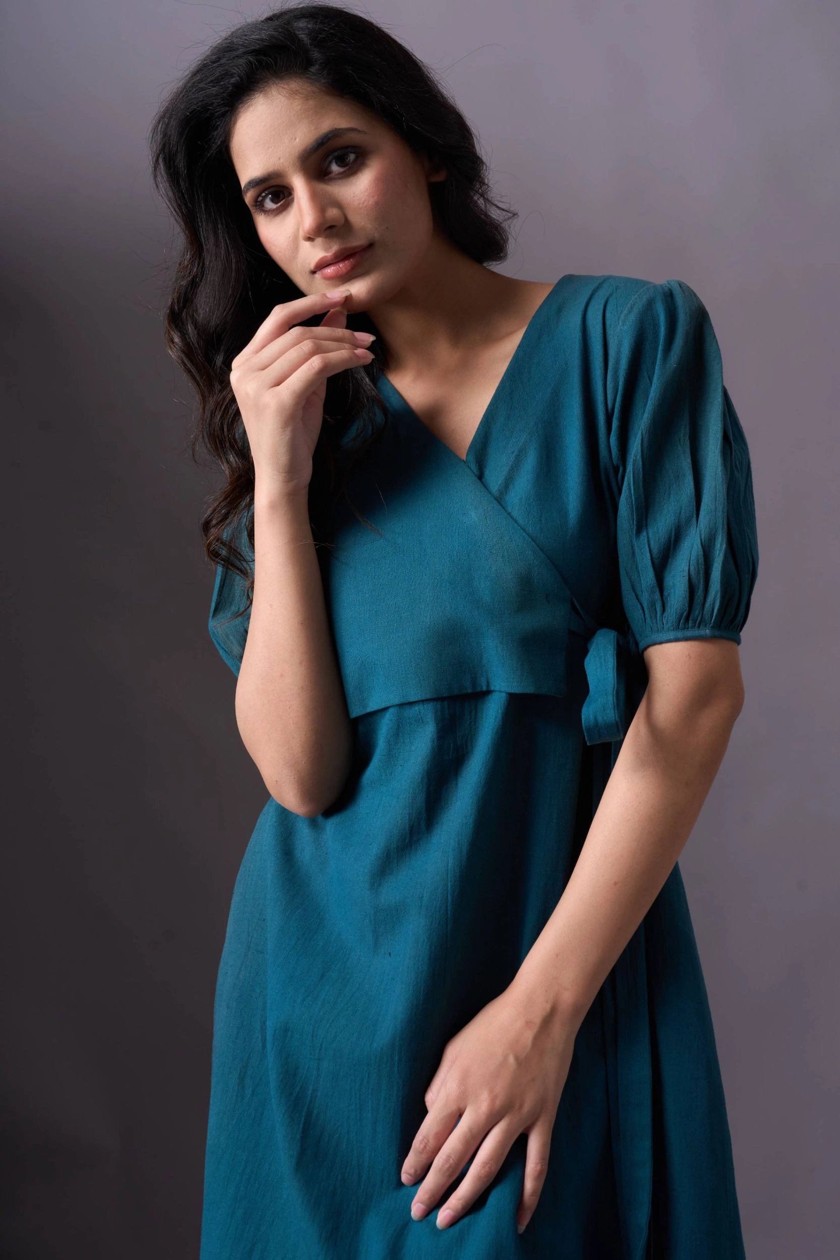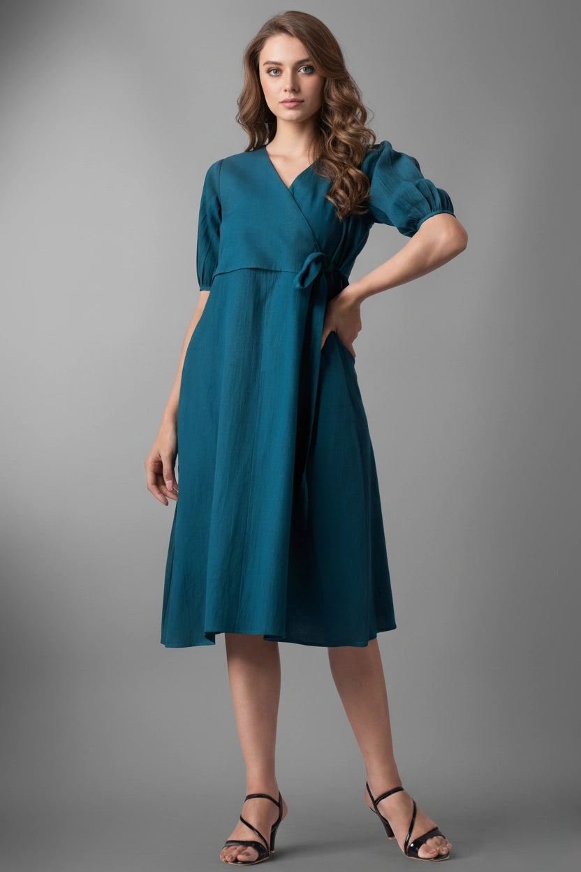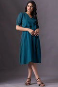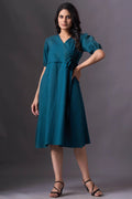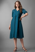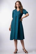 Introducing our Teal Blue Short Elbow Sleeve V-Neck Dress with Belt, a perfect blend of elegance and comfort. This dress features short puffed sleeves and a stylish V-neckline. The layered design and a belt tied at the waist create a flattering silhouette. Ideal for both casual and semi-formal occasions.